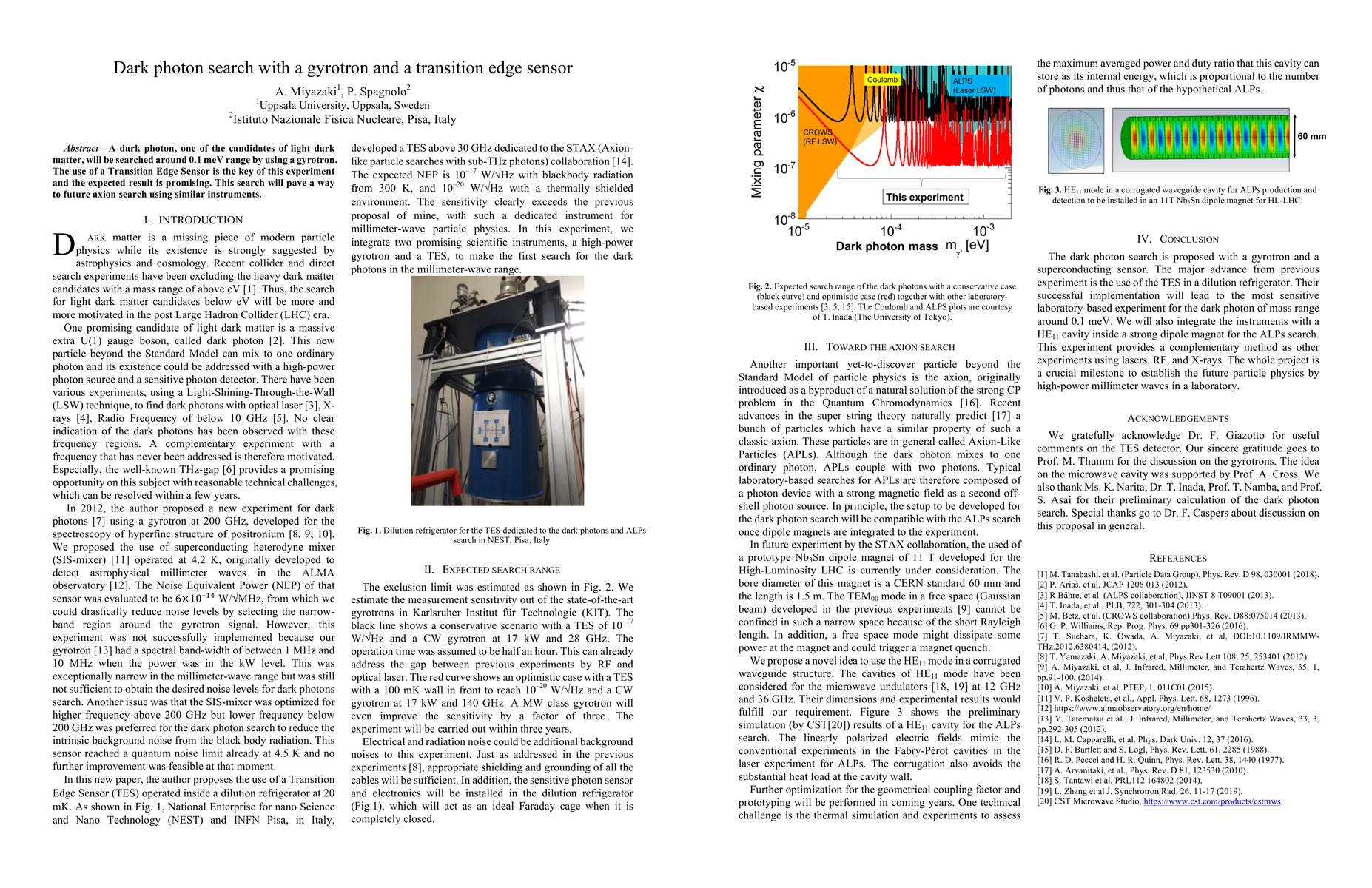 This paper explores the search for dark photons, potential candidates for light dark matter, in the 0.1 meV range using a gyrotron and a Transition Edge Sensor. The promising results from this experiment could lead to future axion searches with similar instrumentation.