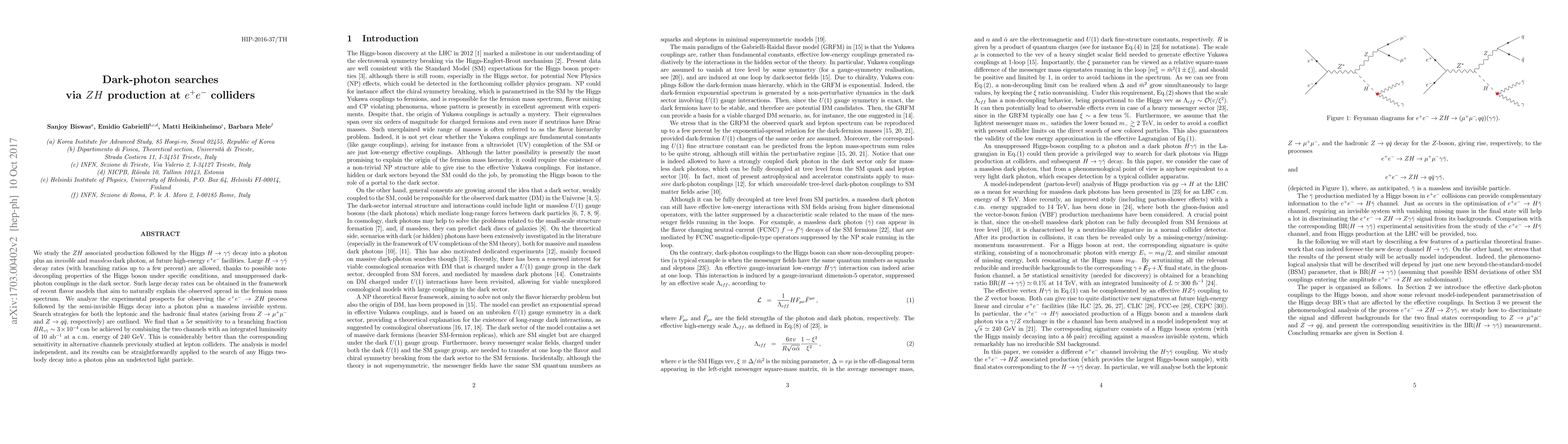 This paper investigates the potential for detecting dark photons via $ZH$ production at future high-energy $e^+e^-$ colliders, focusing on Higgs decay into a photon and a massless dark photon. It outlines search strategies for both leptonic and hadronic final states and concludes that a $5\sigma$ sensitivity to a branching fraction of $BR_{\gamma\bar{\gamma}}\sim 3\times 10^{-4}$ can be achieved with an integrated luminosity of 10 ab$^{-1}$ at 240 GeV.