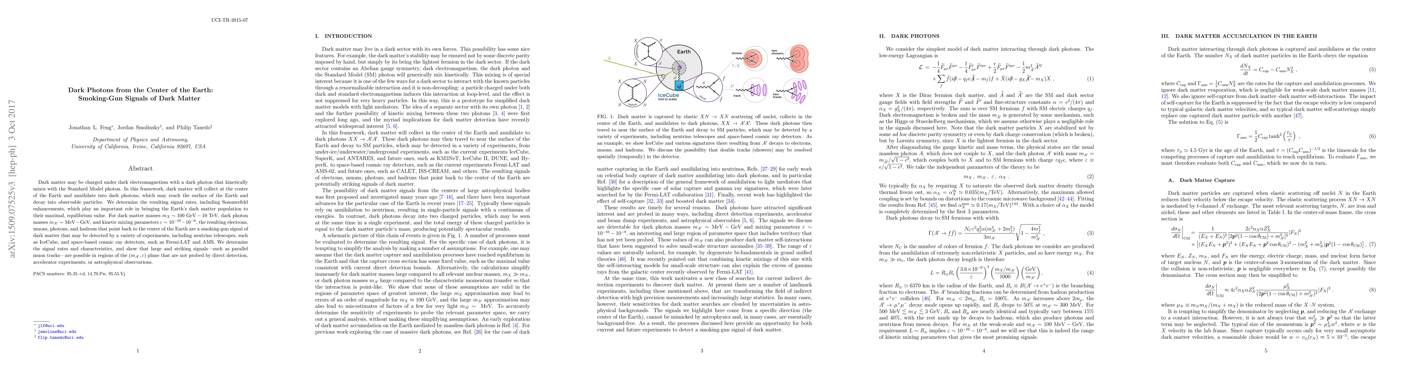 Dark matter may be charged under dark electromagnetism with a dark photon that kinetically mixes with the Standard Model photon. In this framework, dark matter will collect at the center of the Earth and annihilate into dark photons, which may reach the surface of the Earth and decay into observable particles. We determine the resulting signal rates, including Sommerfeld enhancements, which play an important role in bringing the Earth's dark matter population to their maximal, equilibrium value. For dark matter masses $m_X \sim$ 100 GeV - 10 TeV, dark photon masses $m_{A'} \sim$ MeV - GeV, and kinetic mixing parameters $\varepsilon \sim 10^{-10} - 10^{-8}$, the resulting electrons, muons, photons, and hadrons that point back to the center of the Earth are a smoking-gun signal of dark matter that may be detected by a variety of experiments, including neutrino telescopes, such as IceCube, and space-based cosmic ray detectors, such as Fermi-LAT and AMS. We determine the signal rates and characteristics, and show that large and striking signals---such as parallel muon tracks---are possible in regions of the $(m_{A'}, \varepsilon)$ plane that are not probed by direct detection, accelerator experiments, or astrophysical observations.