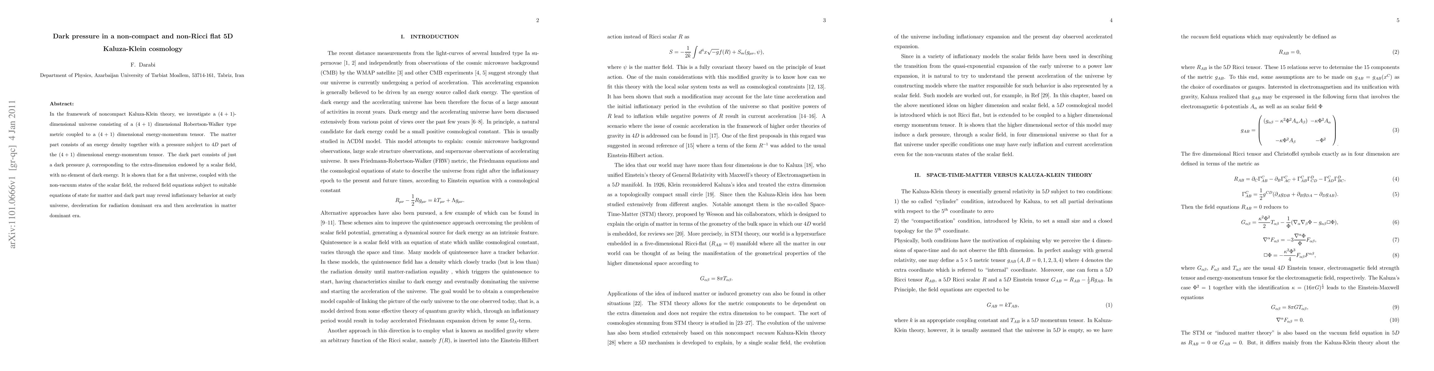 In the framework of noncompact Kaluza-Klein theory, we investigate a $(4+1)$-dimensional universe consisting of a $(4+1)$ dimensional Robertson-Walker type metric coupled to a $(4+1)$ dimensional energy-momentum tensor. The matter part consists of an energy density together with a pressure subject to 4D part of the $(4+1)$ dimensional energy-momentum tensor. The dark part consists of just a dark pressure $\bar{p}$, corresponding to the extra-dimension endowed by a scalar field, with no element of dark energy. It is shown that for a flat universe, coupled with the non-vacuum states of the scalar field, the reduced field equations subject to suitable equations of state for matter and dark part may reveal inflationary behavior at early universe, deceleration for radiation dominant era and then acceleration in matter dominant era.
