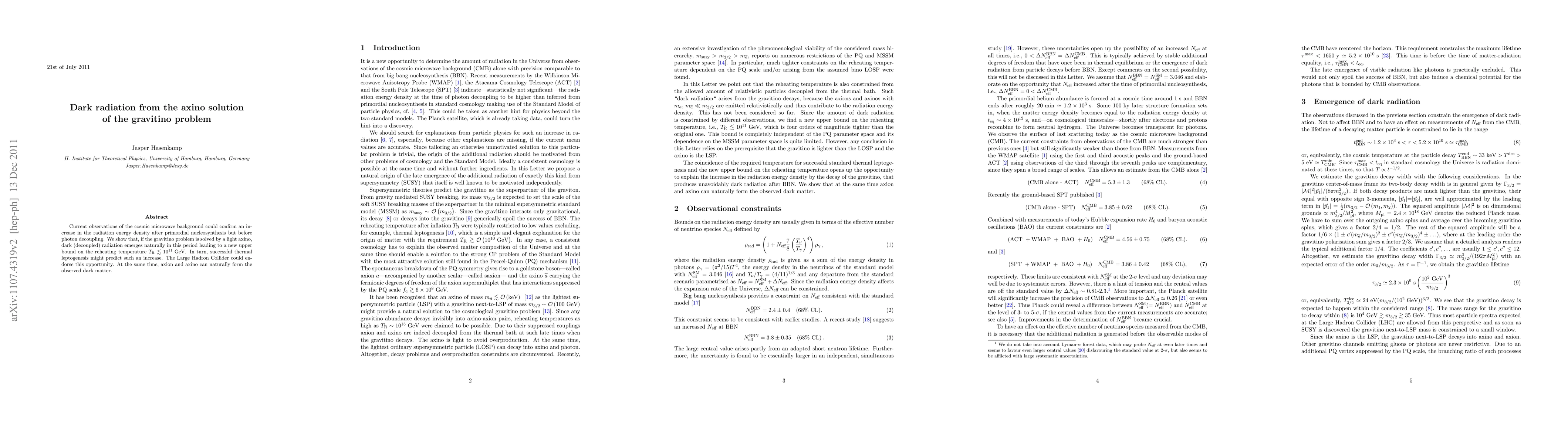 Current observations of the cosmic microwave background could confirm an increase in the radiation energy density after primordial nucleosynthesis but before photon decoupling. We show that, if the gravitino problem is solved by a light axino, dark (decoupled) radiation emerges naturally in this period leading to a new upper bound on the reheating temperature T_R < 10^{11} GeV. In turn, successful thermal leptogenesis might predict such an increase. The Large Hadron Collider could endorse this opportunity. At the same time, axion and axino can naturally form the observed dark matter.