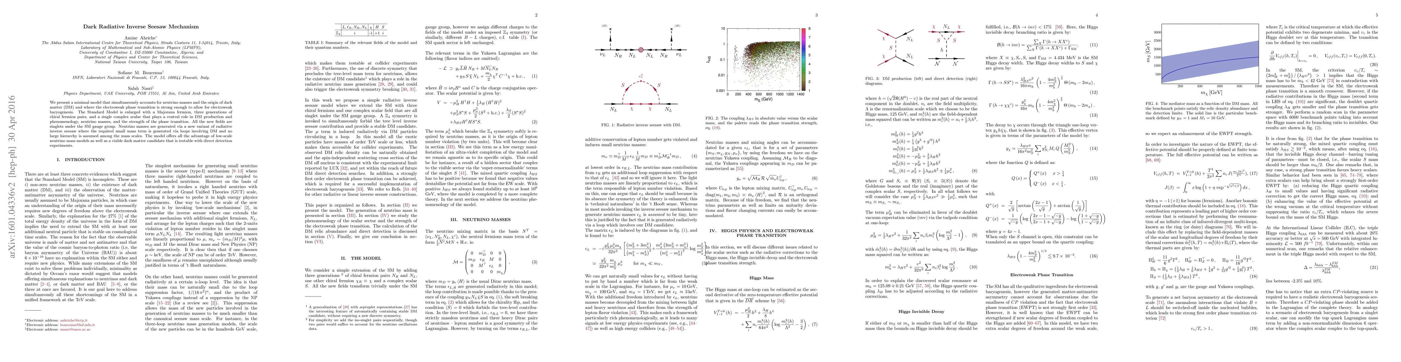 This paper proposes a minimal model that integrates the dark radiative inverse seesaw mechanism to explain both neutrino masses and dark matter origins, while ensuring a strong electroweak phase transition conducive to electroweak baryogenesis. The model introduces new fields, including a Majorana fermion and a complex scalar, which facilitate the generation of small neutrino masses through radiative inverse seesaw loops, offering a testable dark matter candidate.