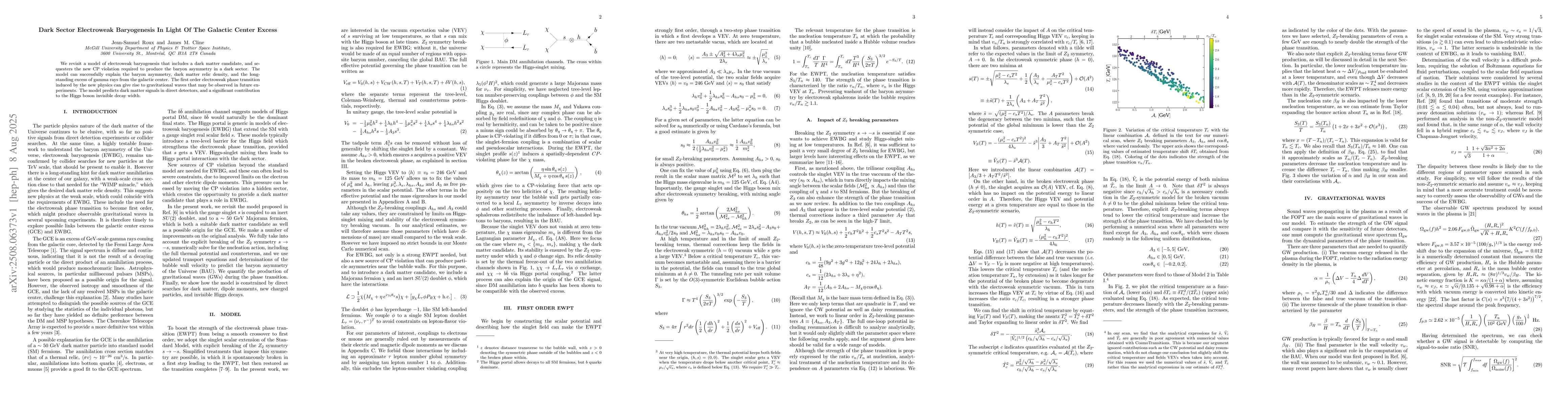 The paper presents a refined model of electroweak baryogenesis that incorporates a dark matter candidate and new CP violation, sequestered from the Standard Model, to explain observed phenomena including baryon asymmetry, dark matter relic density, and the gamma-ray excess from the galactic center.