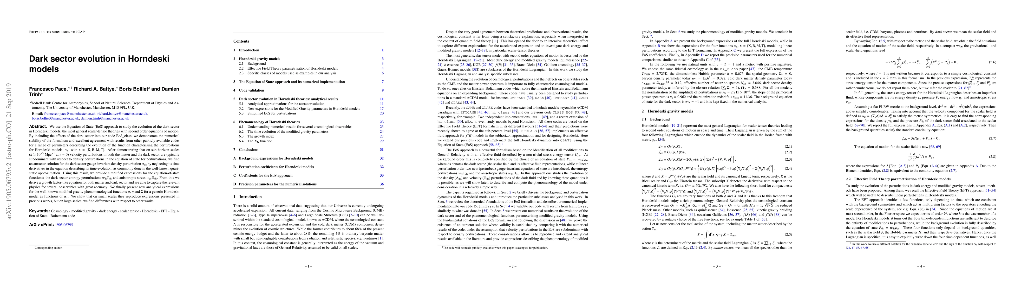 This paper investigates the evolution of the dark sector in Horndeski models using the EoS approach, demonstrating numerical stability and agreement with other codes. It finds subdominant velocity perturbations on sub-horizon scales and derives simplified expressions for dark sector entropy perturbations and anisotropic stress, providing new analytical expressions for modified gravity functions that differ on large scales from previous works.