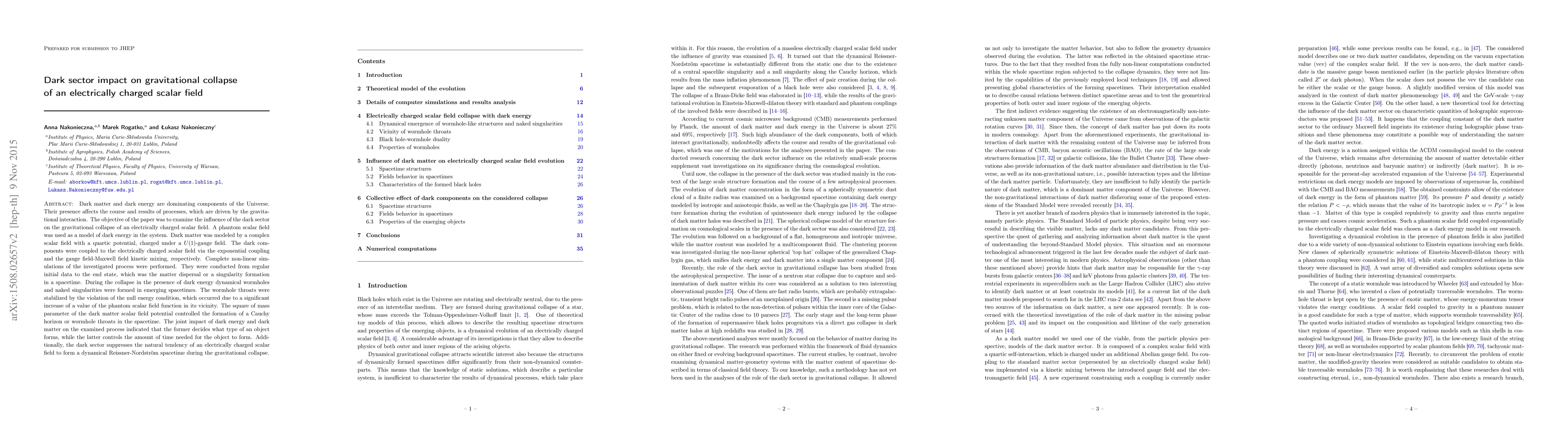 This paper investigates how dark sector components—dark energy and dark matter—affect the gravitational collapse of an electrically charged scalar field. Simulations reveal that dark energy influences the formation of dynamical wormholes and naked singularities, while dark matter determines the time scale for these formations. The dark sector also suppresses the formation of a dynamical Reissner-Nordström spacetime.