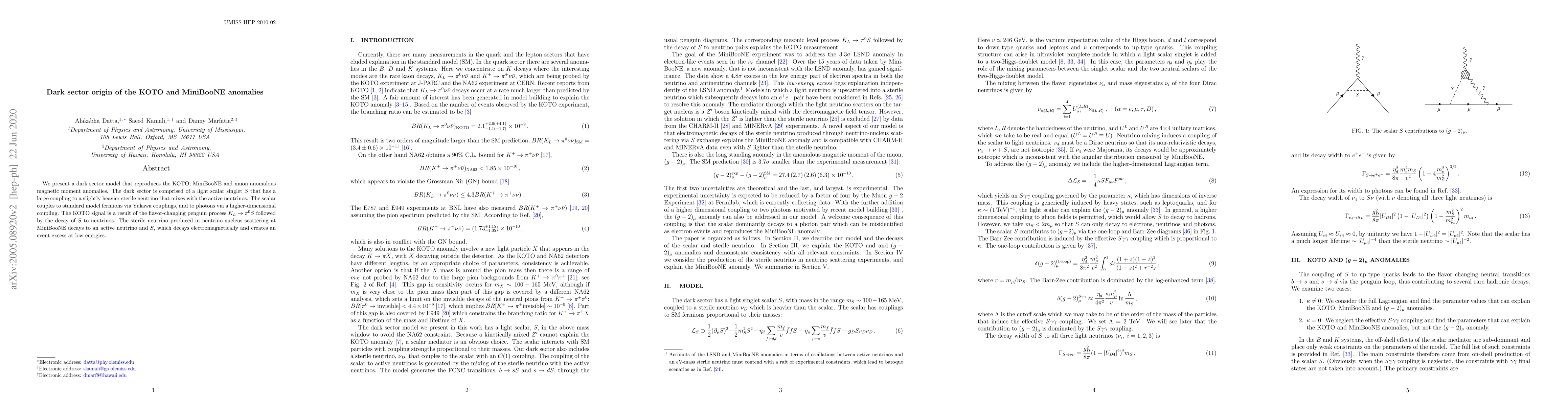 We present a dark sector model that reproduces the KOTO, MiniBooNE and muon anomalous magnetic moment anomalies. The dark sector is comprised of a light scalar singlet $S$ that has a large coupling to a slightly heavier sterile neutrino that mixes with the active neutrinos. The scalar couples to standard model fermions via Yukawa couplings, and to photons via a higher-dimensional coupling. The KOTO signal is a result of the flavor-changing penguin process $K_L \to \pi^0 S$ followed by the decay of $S$ to neutrinos. The sterile neutrino produced in neutrino-nucleus scattering at MiniBooNE decays to an active neutrino and $S$, which decays electromagnetically and creates an event excess at low energies.