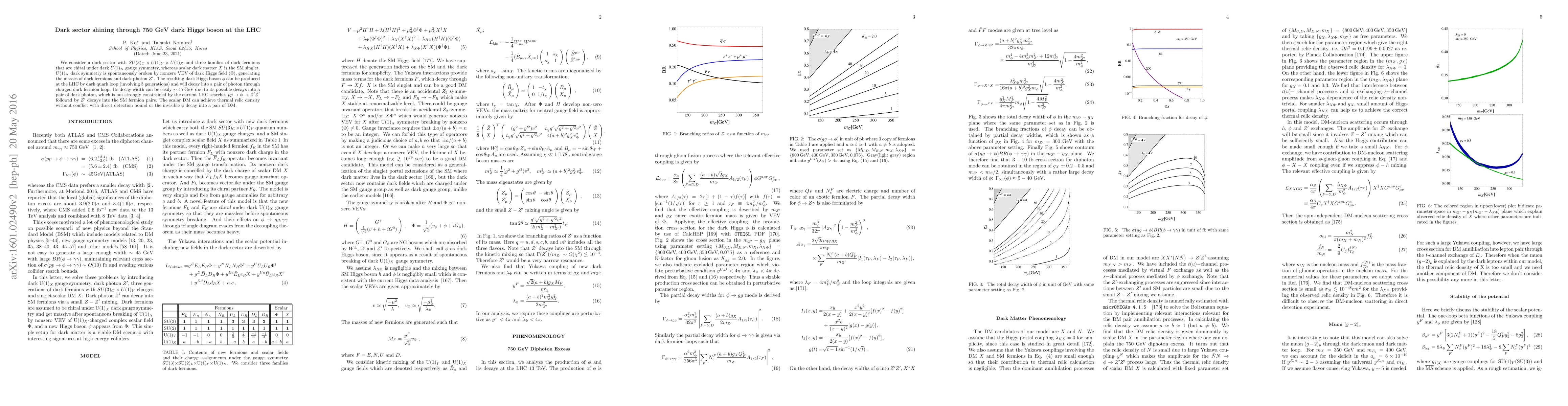 This paper proposes a dark sector model with a 750 GeV dark Higgs boson, $phi$, produced via dark quark loops at the LHC, decaying into photons through charged dark fermion loops. The dark sector features $SU(3)_C imes U(1)_Y imes U(1)_X$ gauge symmetry, dark fermions, and a dark photon $Z^prime$. The dark Higgs boson's decay width of ~45 GeV is facilitated by decays into dark photon pairs, unconstrained by current LHC searches. The model also accommodates a scalar dark matter candidate with desired thermal relic density and compatibility with direct detection bounds.