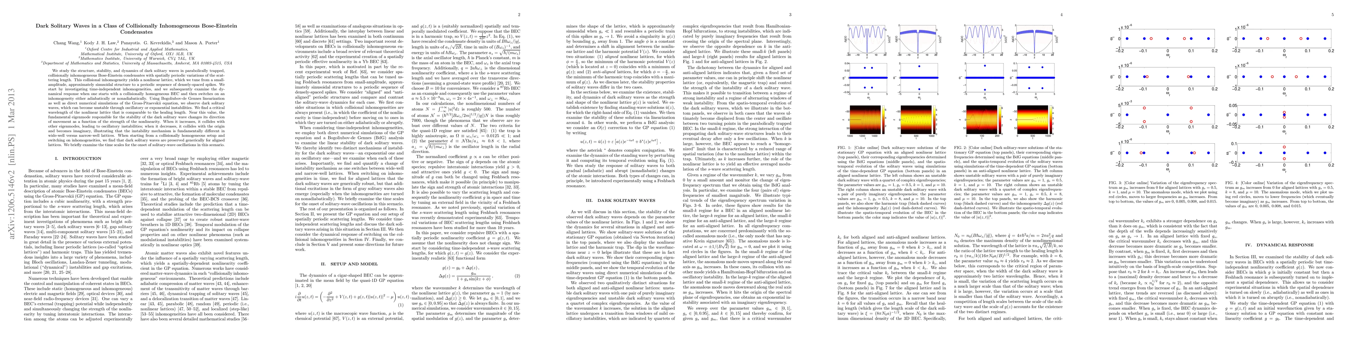 We study the structure, stability, and dynamics of dark solitary waves in parabolically trapped, collisionally inhomogeneous Bose-Einstein condensates (BECs) with spatially periodic variations of the scattering length. This collisional inhomogeneity yields a nonlinear lattice, which we tune from a small-amplitude, approximately sinusoidal structure to a periodic sequence of densely spaced spikes. We start by investigating time-independent inhomogeneities, and we subsequently examine the dynamical response when one starts with a collisionally homogeneous BEC and then switches on an inhomogeneity either adiabatically or nonadiabatically. Using Bogoliubov-de Gennes linearization as well as direct numerical simulations of the Gross-Pitaevskii equation, we observe dark solitary waves, which can become unstable through oscillatory or exponential instabilities. We find a critical wavelength of the nonlinear lattice that is comparable to the healing length. Near this value, the fundamental eigenmode responsible for the stability of the dark solitary wave changes its direction of movement as a function of the strength of the nonlinearity. When it increases, it collides with other eigenmodes, leading to oscillatory instabilities; when it decreases, it collides with the origin and becomes imaginary, illustrating that the instability mechanism is fundamentally different in wide-well versus narrow-well lattices. When starting from a collisionally homogeneous setup and switching on inhomogeneities, we find that dark solitary waves are preserved generically for aligned lattices. We briefly examine the time scales for the onset of solitary-wave oscillations in this scenario.