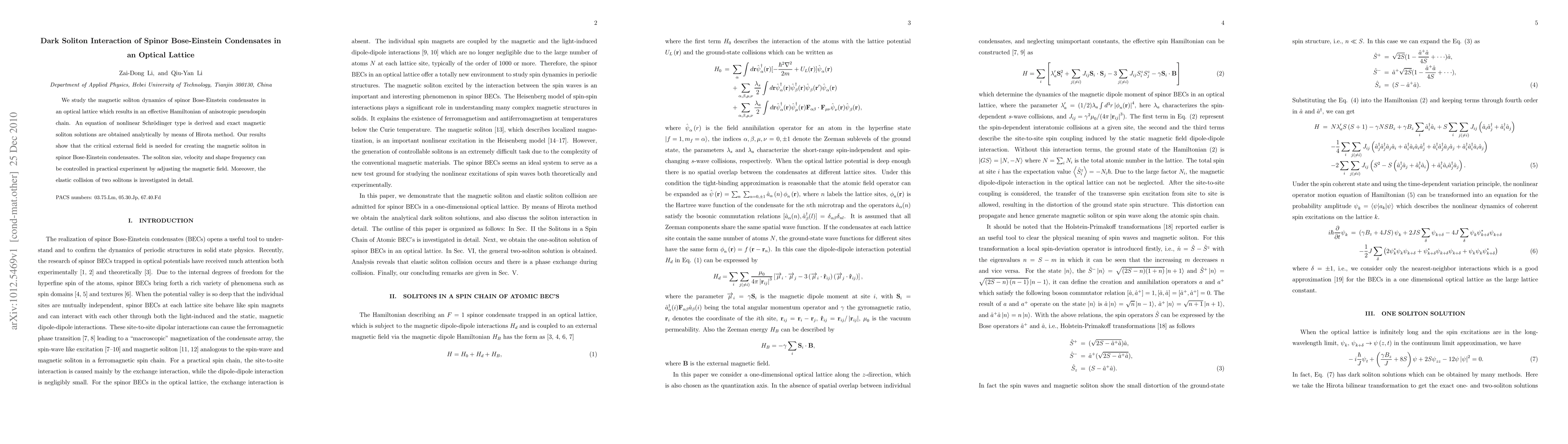 This paper investigates the dynamics of magnetic solitons in spinor Bose-Einstein condensates within an optical lattice, deriving a nonlinear Schrödinger equation and obtaining exact soliton solutions analytically. It demonstrates that a critical external magnetic field is necessary for soliton formation, and soliton properties can be manipulated via magnetic field adjustments.