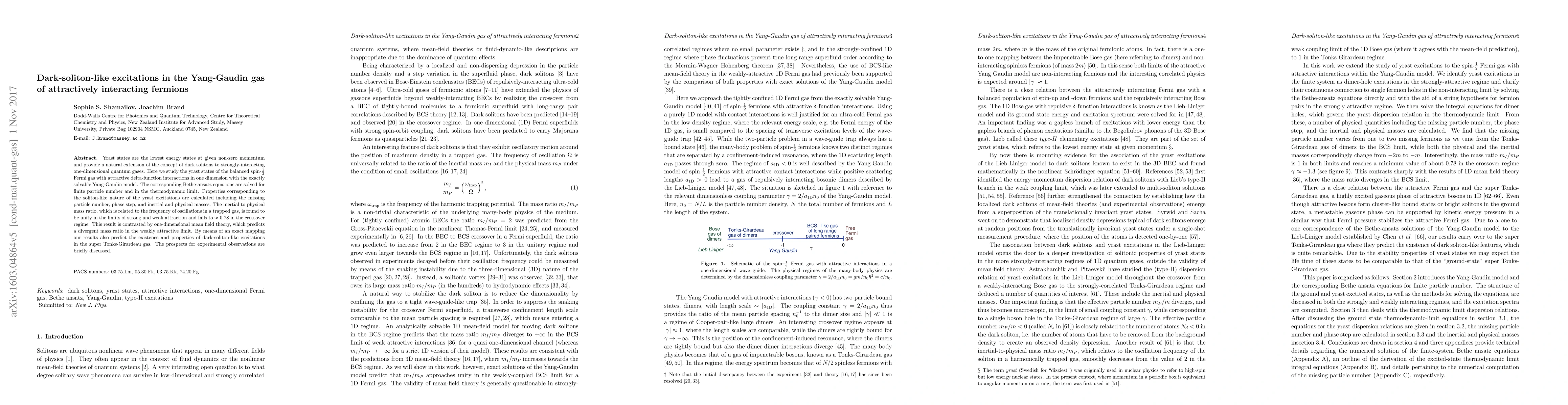 This paper investigates yrast states in a one-dimensional gas of attractively interacting fermions using the Yang-Gaudin model, revealing soliton-like excitations. The inertial to physical mass ratio is unity in strong and weak attraction, contrasting with mean field theory predictions, and falls to approximately 0.78 in the crossover regime, with implications for experimental observations.