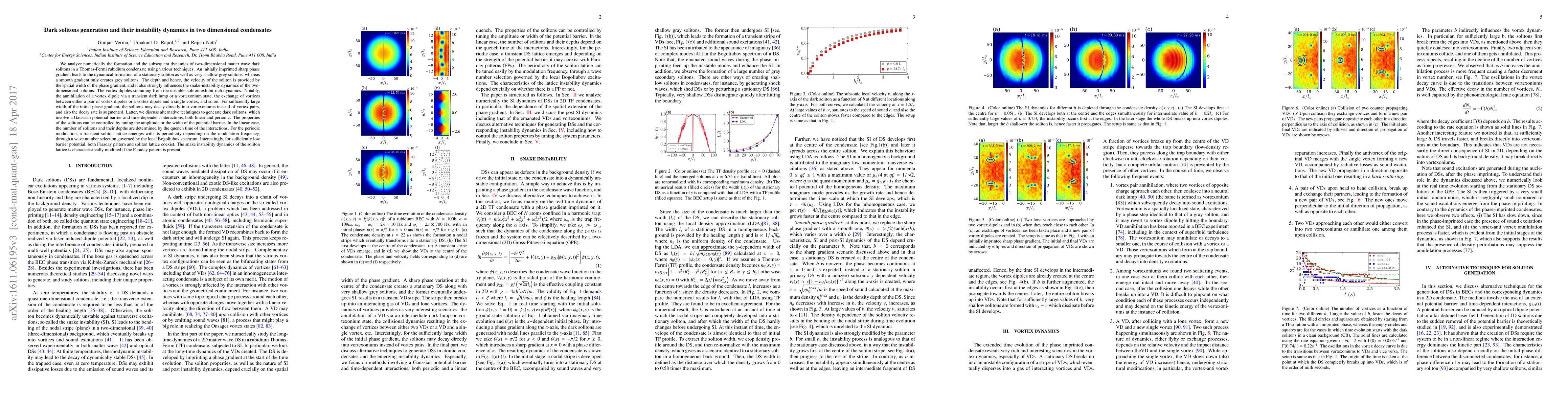 We analyze numerically the formation and the subsequent dynamics of two-dimensional matter wave dark solitons in a Thomas-Fermi rubidium condensate using various techniques. An initially imprinted sharp phase gradient leads to the dynamical formation of a stationary soliton as well as very shallow grey solitons, whereas a smooth gradient only creates grey solitons. The depth and hence, the velocity of the soliton is provided by the spatial width of the phase gradient, and it also strongly influences the snake-instability dynamics of the two dimensional solitons. The vortex dipoles stemming from the unstable soliton exhibit rich dynamics. Notably, the annihilation of a vortex dipole via a transient dark lump or a vortexonium state, the exchange of vortices between either a pair of vortex dipoles or a vortex dipole and a single vortex, and so on. For sufficiently large width of the initial phase gradient, the solitons may decay directly into vortexoniums instead of vortex pairs, and also the decay rate is augmented. Later, we discuss alternative techniques to generate dark solitons, which involve a Gaussian potential barrier and time-dependent interactions, both linear and periodic. The properties of the solitons can be controlled by tuning the amplitude or the width of the potential barrier. In the linear case, the number of solitons and their depths are determined by the quench time of the interactions. For the periodic modulation, a transient soliton lattice emerges with its periodicity depending on the modulation frequency, through a wave number selection governed by the local Bogoliubov spectrum. Interestingly, for sufficiently low barrier potential, both Faraday pattern and soliton lattice coexist. The snake instability dynamics of the soliton lattice is characteristically modified if the Faraday pattern is present.