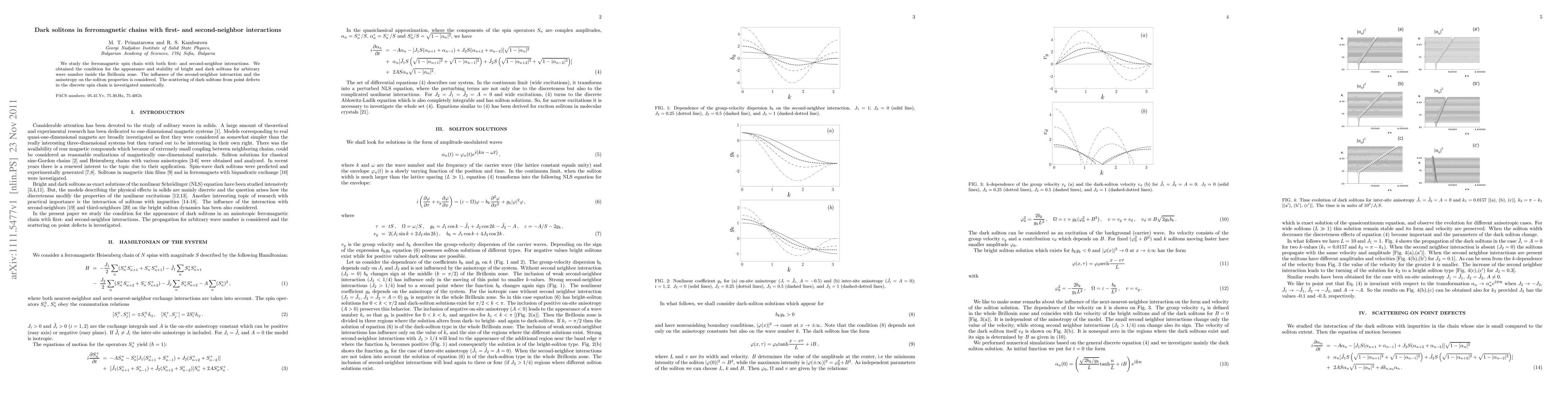 We study the ferromagnetic spin chain with both first- and second-neighbor interactions. We obtained the condition for the appearance and stability of bright and dark solitons for arbitrary wave number inside the Brillouin zone. The influence of the second-neighbor interaction and the anisotropy on the soliton properties is considered. The scattering of dark solitons from point defects in the discrete spin chain is investigated numerically.