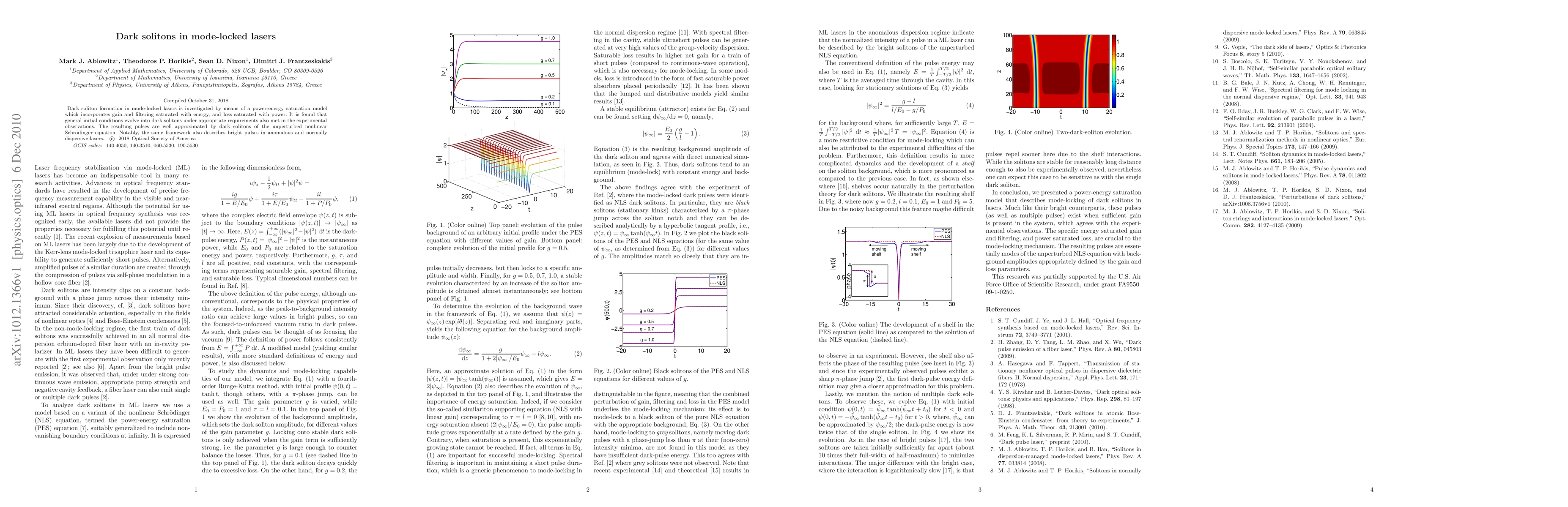 This paper investigates the formation of dark solitons in mode-locked lasers using a power-energy saturation model, revealing that initial conditions evolve into dark solitons under specific conditions. The model also accurately describes bright pulses in different laser dispersion regimes.