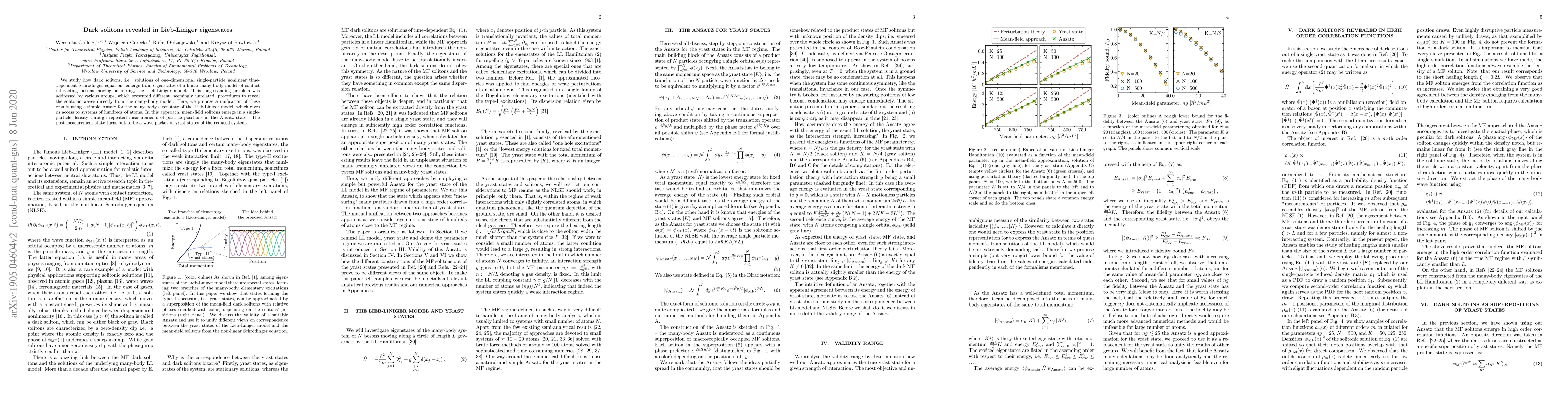 We study how dark solitons, i.e. solutions of one-dimensional single-particle nonlinear time-dependent Schr\"odinger equation, emerge from eigenstates of a linear many-body model of contact interacting bosons moving on a ring, the Lieb-Liniger model. This long-standing problem was addressed by various groups, which presented different, seemingly unrelated, procedures to reveal the solitonic waves directly from the many-body model. Here, we propose a unification of these results using a simple Ansatz for the many-body eigenstate of the Lieb-Liniger model, which gives us access to systems of hundreds of atoms. In this approach, mean-field solitons emerge in a single-particle density through repeated measurements of particle positions in the Ansatz state. The post-measurement state turns out to be a wave packet of yrast states of the reduced system.