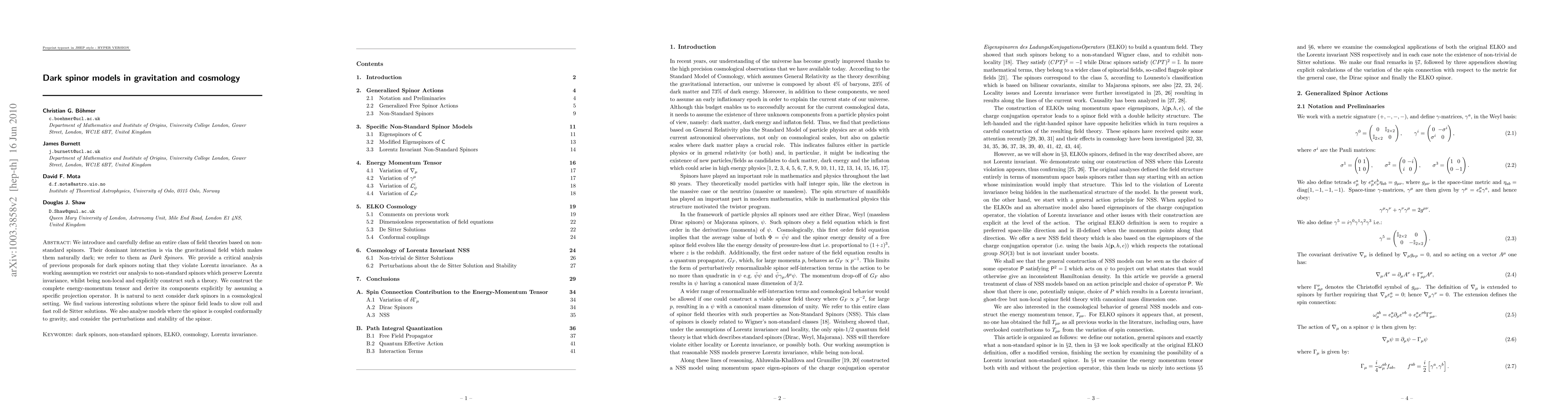 We introduce and carefully define an entire class of field theories based on non-standard spinors. Their dominant interaction is via the gravitational field which makes them naturally dark; we refer to them as Dark Spinors. We provide a critical analysis of previous proposals for dark spinors noting that they violate Lorentz invariance. As a working assumption we restrict our analysis to non-standard spinors which preserve Lorentz invariance, whilst being non-local and explicitly construct such a theory. We construct the complete energy-momentum tensor and derive its components explicitly by assuming a specific projection operator. It is natural to next consider dark spinors in a cosmological setting. We find various interesting solutions where the spinor field leads to slow roll and fast roll de Sitter solutions. We also analyse models where the spinor is coupled conformally to gravity, and consider the perturbations and stability of the spinor.