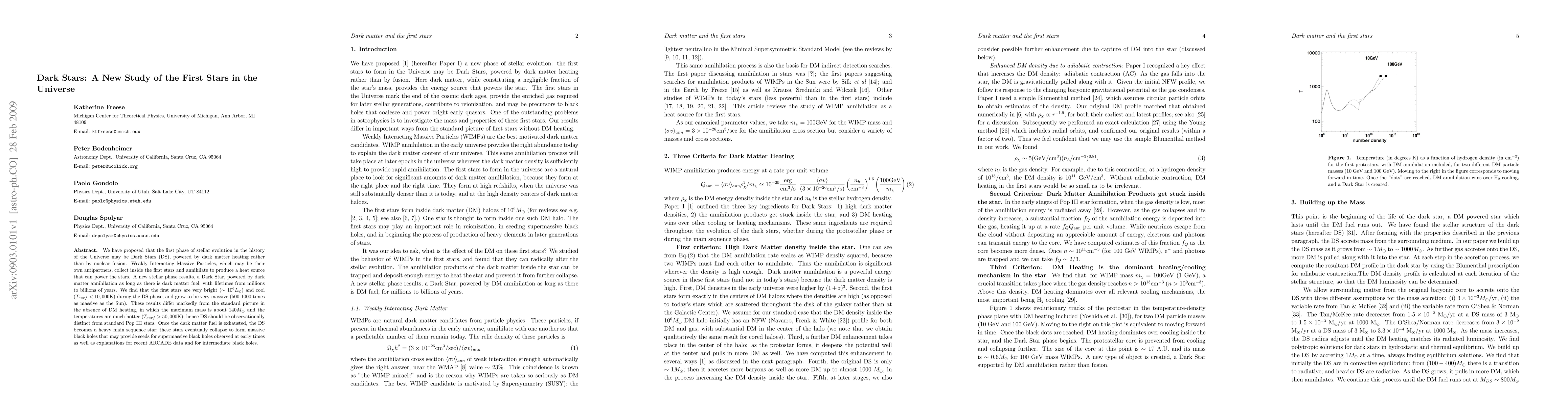 This study proposes that the first stars in the universe, termed Dark Stars, are powered by dark matter annihilation rather than nuclear fusion, resulting in stars that are exceptionally bright, cool, and massive compared to conventional models. Once dark matter is depleted, these stars evolve into heavy main sequence stars, eventually collapsing to form massive black holes.