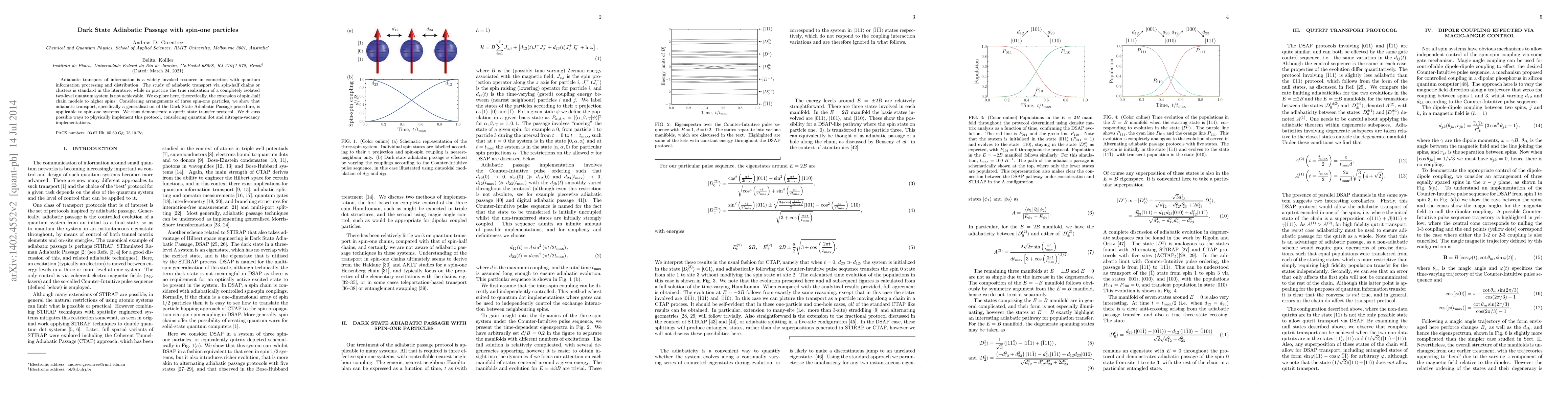 This paper theoretically extends adiabatic transport methods from spin-half to spin-one systems, demonstrating a Dark State Adiabatic Passage protocol for three spin-one particles, or qutrits. The authors propose practical implementations using quantum dots and nitrogen-vacancy centers.