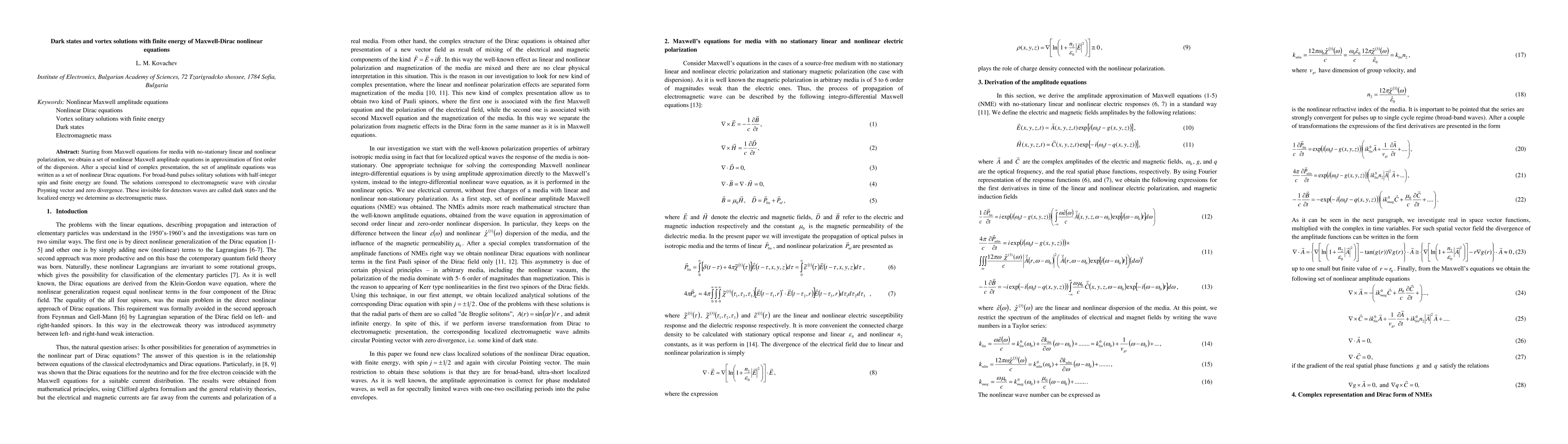 Starting from Maxwell equations for media with no-stationary linear and nonlinear polarization, we obtain a set of nonlinear Maxwell amplitude equations in approximation of first order of the dispersion. After a special kind of complex presentation, the set of amplitude equations was written as a set of nonlinear Dirac equations. For broad-band pulses solitary solutions with half-integer spin and finite energy are found. The solutions correspond to electromagnetic wave with circular Poynting vector and zero divergence. These invisible for detectors waves are called dark states and the localized energy we determine as electromagnetic mass.