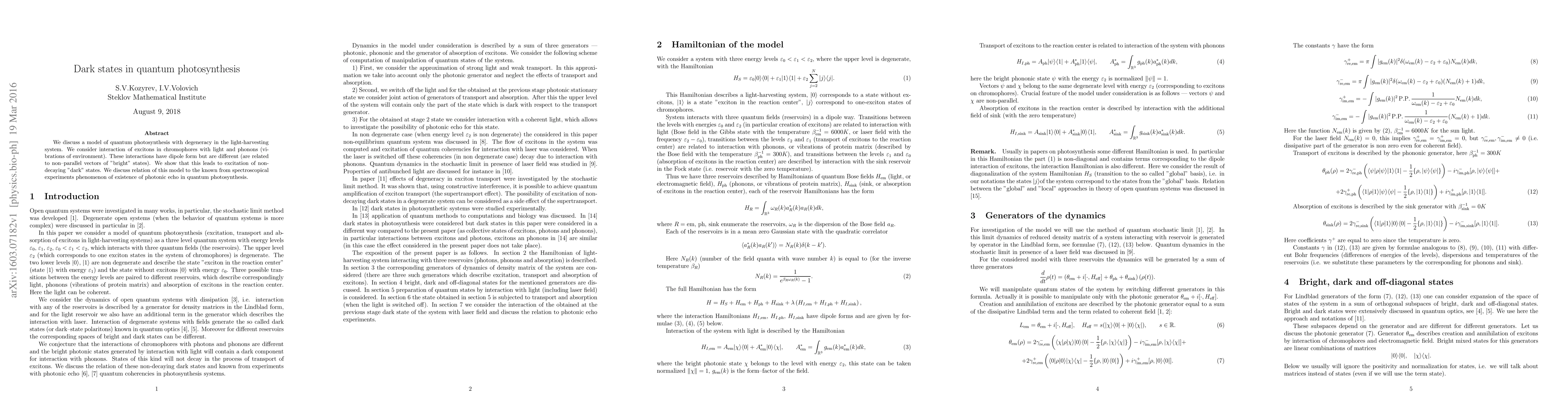 Researchers model quantum photosynthesis with interactions between light, phonons, and chromophores, discovering dark states that can persist even in the presence of light. This finding relates to observed phenomena like photonic echoes in quantum photosynthesis.