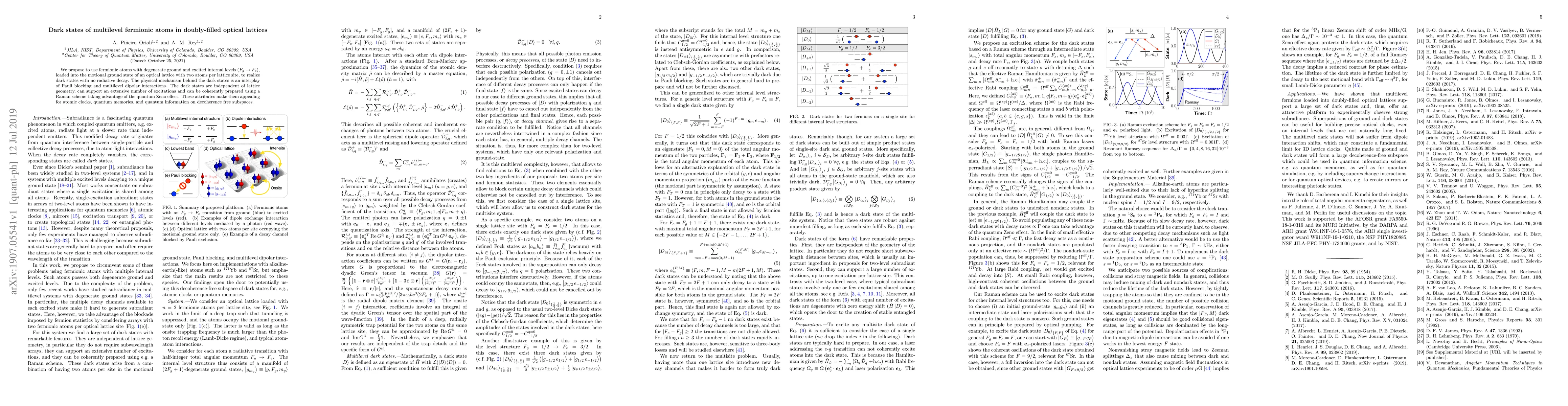 We propose to use fermionic atoms with degenerate ground and excited internal levels ($F_g\rightarrow F_e$), loaded into the motional ground state of an optical lattice with two atoms per lattice site, to realize dark states with no radiative decay. The physical mechanism behind the dark states is an interplay of Pauli blocking and multilevel dipolar interactions. The dark states are independent of lattice geometry, can support an extensive number of excitations and can be coherently prepared using a Raman scheme taking advantage of the quantum Zeno effect. These attributes make them appealing for atomic clocks, quantum memories, and quantum information on decoherence free subspaces.