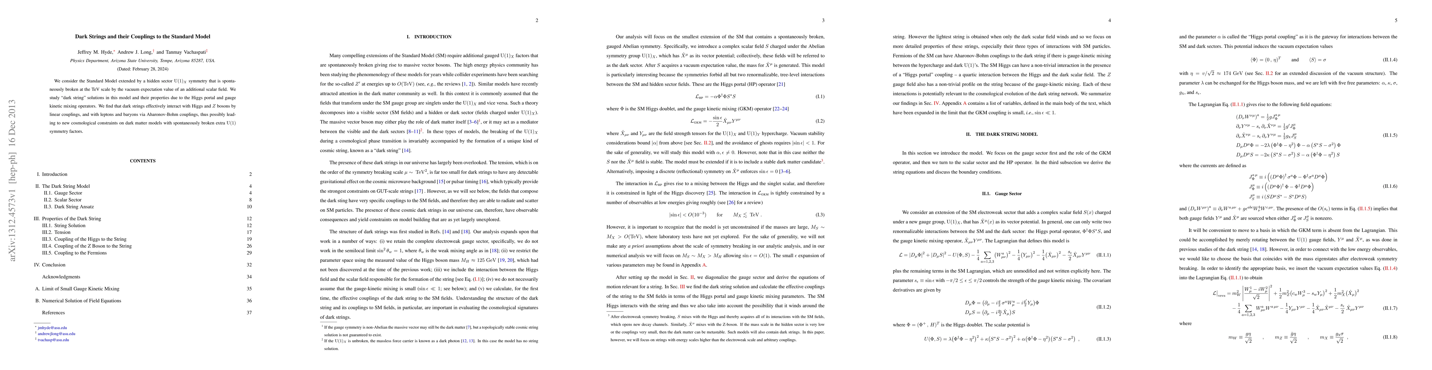 Researchers study dark strings in a modified Standard Model with spontaneously broken extra U(1) symmetry, finding linear interactions with Higgs and Z bosons, and Aharonov-Bohm couplings with leptons and baryons.
