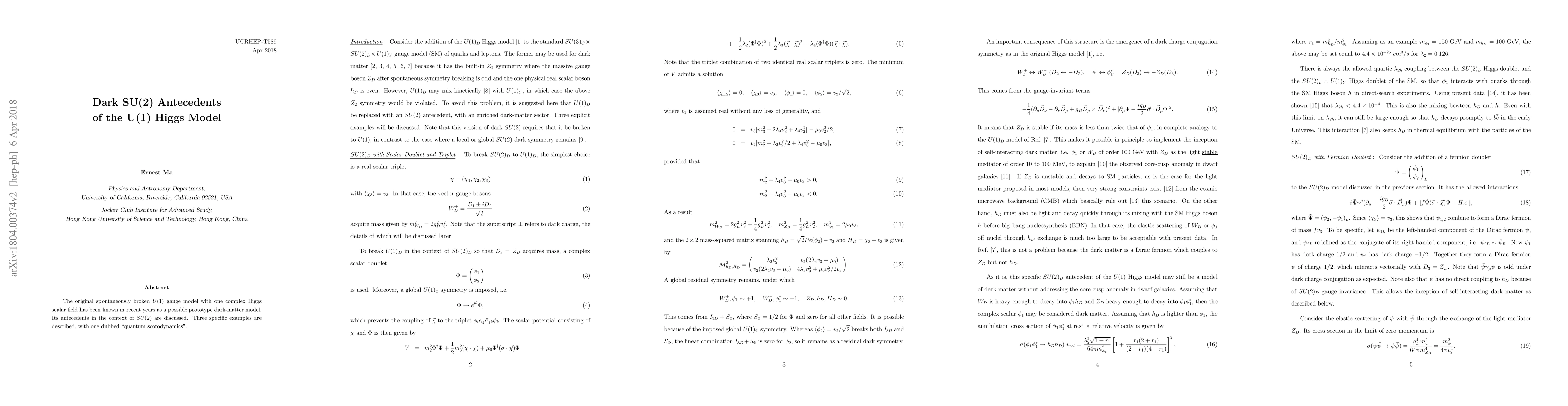 This paper explores the origins of a spontaneously broken U(1) gauge model with a complex Higgs scalar, proposing it as a dark-matter prototype. It delves into its SU(2) antecedents, highlighting three specific examples, including one termed "quantum scotodynamics."
