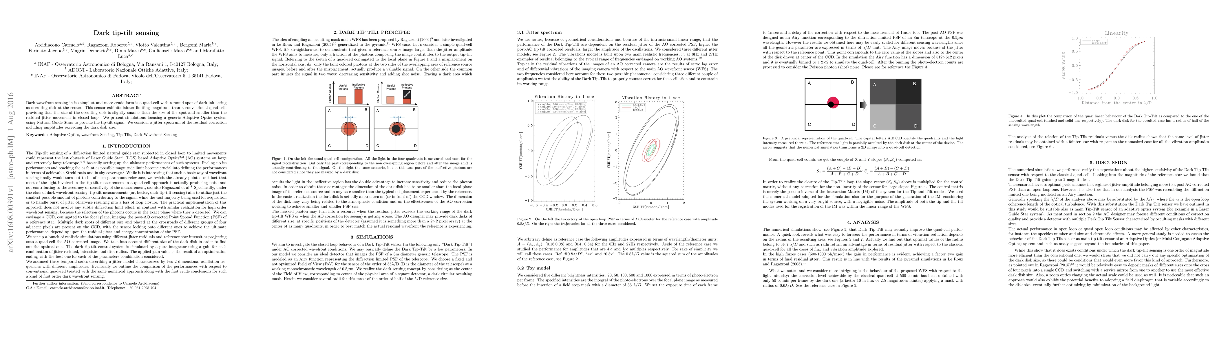 This paper explores dark tip-tilt sensing using a quad-cell with a central occulting disk, demonstrating its capability to achieve fainter limiting magnitudes than conventional methods. Simulations for an Adaptive Optics system using Natural Guide Stars show effective residual jitter correction, even when jitter amplitudes exceed the occulting disk size.