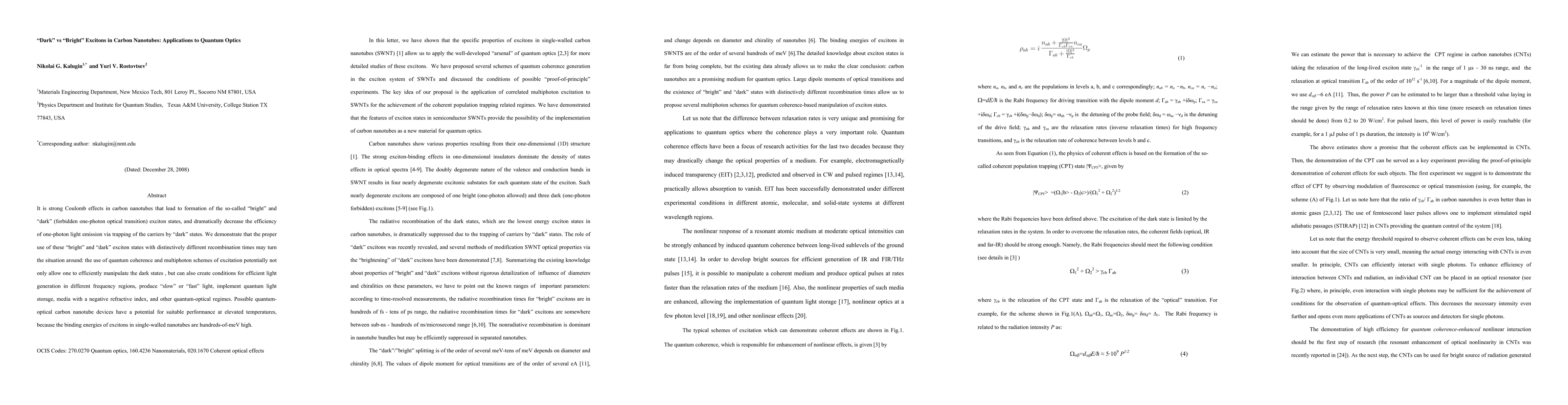 This research explores the impact of "bright" and "dark" exciton states in carbon nanotubes, driven by strong Coulomb effects, on one-photon light emission efficiency. It proposes that quantum coherence and multiphoton excitation schemes can manipulate these states, enabling efficient light generation, quantum light storage, and other quantum-optical applications, even at high temperatures.