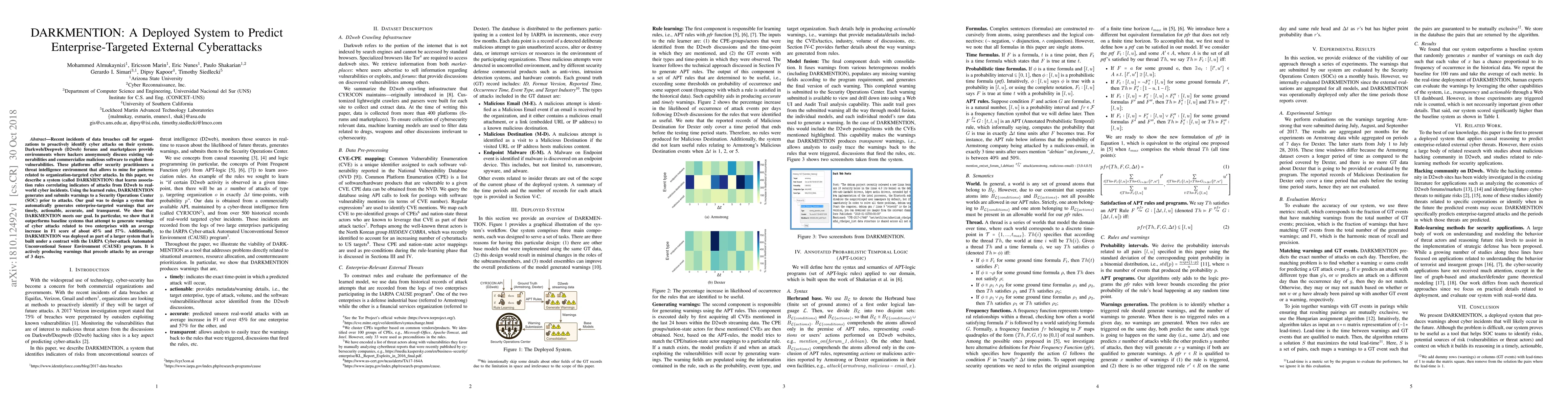 The research describes DARKMENTION, a system that learns association rules from Darkweb/Deepweb (D2web) forums and marketplaces to predict enterprise-targeted cyberattacks. It uses CVE-CPE mappings, nation-state actor associations, and historical enterprise attack logs for rule learning and evaluation.