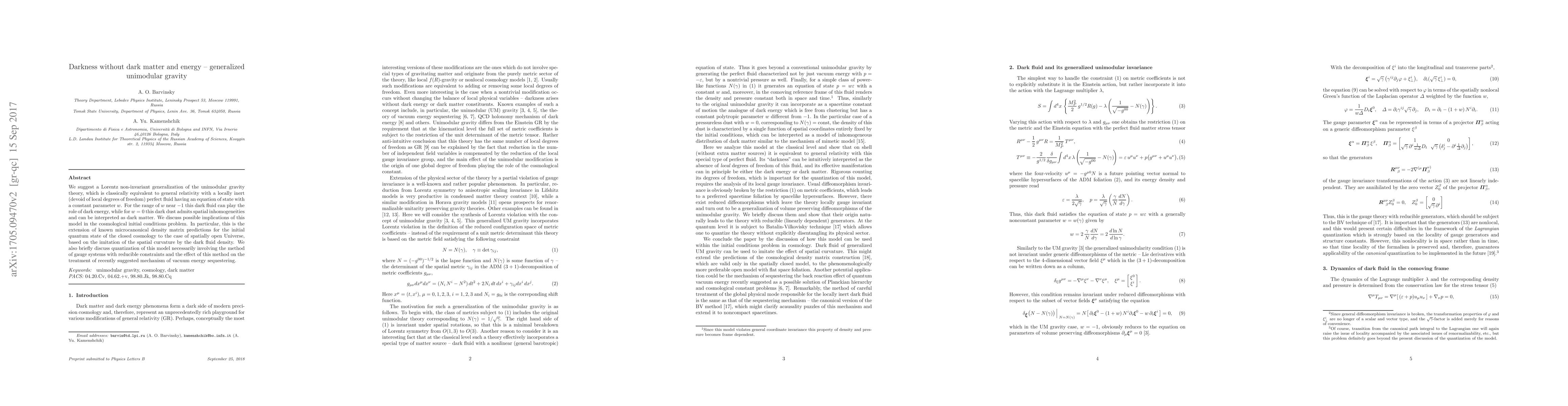 We suggest a Lorentz non-invariant generalization of the unimodular gravity theory, which is classically equivalent to general relativity with a locally inert (devoid of local degrees of freedom) perfect fluid having an equation of state with a constant parameter $w$. For the range of $w$ near $-1$ this dark fluid can play the role of dark energy, while for $w=0$ this dark dust admits spatial inhomogeneities and can be interpreted as dark matter. We discuss possible implications of this model in the cosmological initial conditions problem. In particular, this is the extension of known microcanonical density matrix predictions for the initial quantum state of the closed cosmology to the case of spatially open Universe, based on the imitation of the spatial curvature by the dark fluid density. We also briefly discuss quantization of this model necessarily involving the method of gauge systems with reducible constraints and the effect of this method on the treatment of recently suggested mechanism of vacuum energy sequestering.