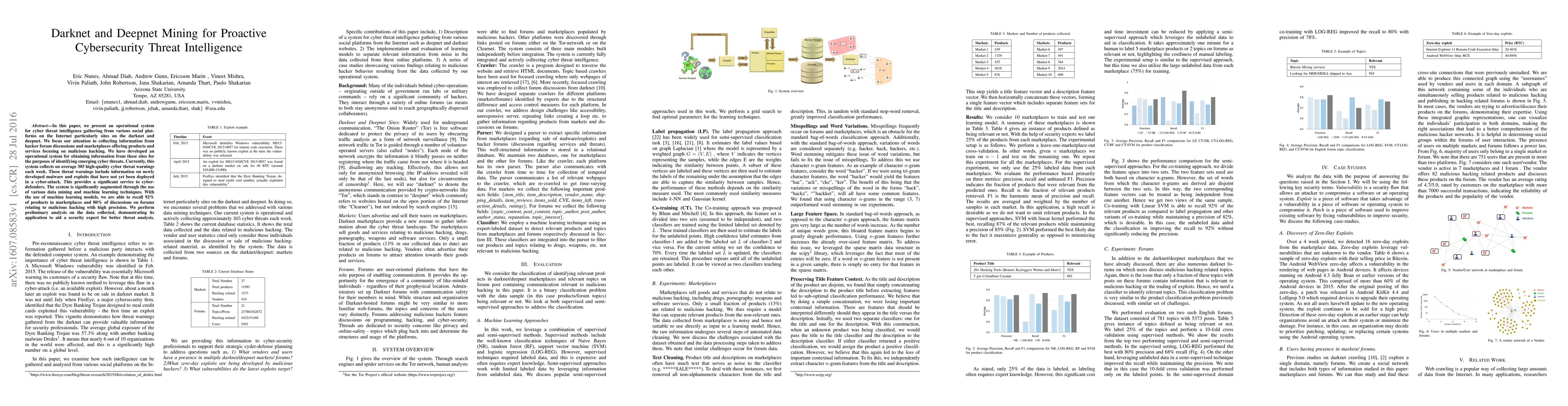 Researchers developed a system to collect cyber threat intelligence from darknet and deepnet sites, collecting 305 high-quality threat warnings per week. Machine learning models were used to recall 92% of malicious products and 80% of forum discussions with high precision.
