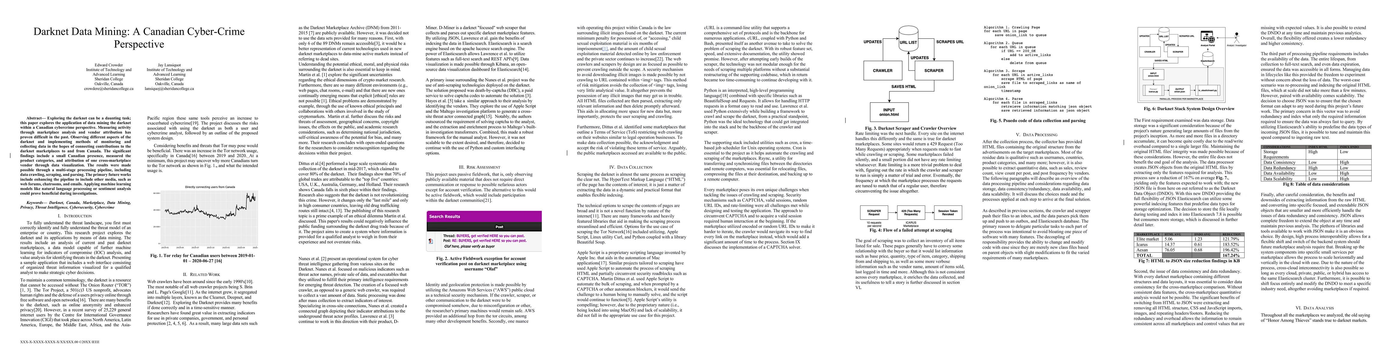 This paper investigates the application of data mining techniques to analyze Canadian cybercrime activity on the darknet, revealing a small Canadian presence and identifying product categories. Future work aims to expand the data collection pipeline and incorporate machine learning for deeper analysis.