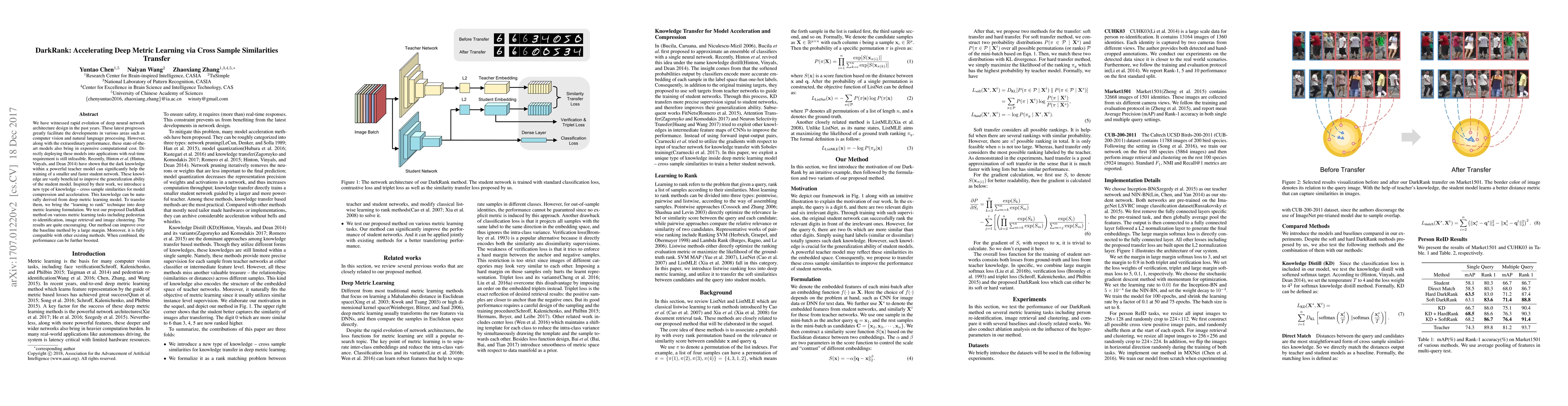 We have witnessed rapid evolution of deep neural network architecture design in the past years. These latest progresses greatly facilitate the developments in various areas such as computer vision and natural language processing. However, along with the extraordinary performance, these state-of-the-art models also bring in expensive computational cost. Directly deploying these models into applications with real-time requirement is still infeasible. Recently, Hinton etal. have shown that the dark knowledge within a powerful teacher model can significantly help the training of a smaller and faster student network. These knowledge are vastly beneficial to improve the generalization ability of the student model. Inspired by their work, we introduce a new type of knowledge -- cross sample similarities for model compression and acceleration. This knowledge can be naturally derived from deep metric learning model. To transfer them, we bring the "learning to rank" technique into deep metric learning formulation. We test our proposed DarkRank method on various metric learning tasks including pedestrian re-identification, image retrieval and image clustering. The results are quite encouraging. Our method can improve over the baseline method by a large margin. Moreover, it is fully compatible with other existing methods. When combined, the performance can be further boosted.