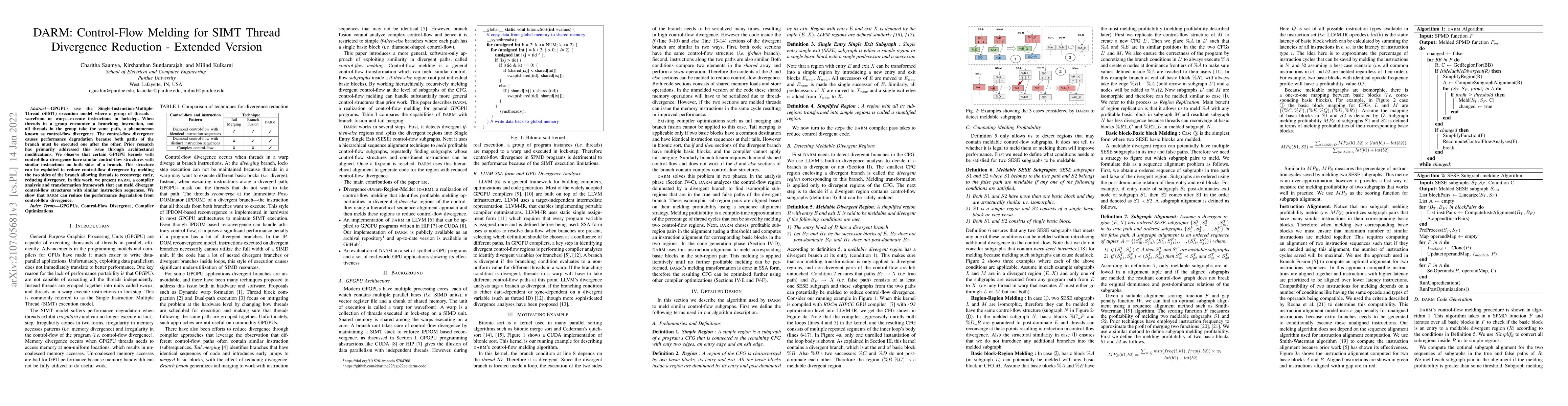 DARM is a compiler framework designed to reduce control-flow divergence in SIMT GPGPUs by melding similar instruction sequences on both sides of a branch. This approach allows threads to reconverge earlier, thereby minimizing performance degradation caused by divergent control flow.