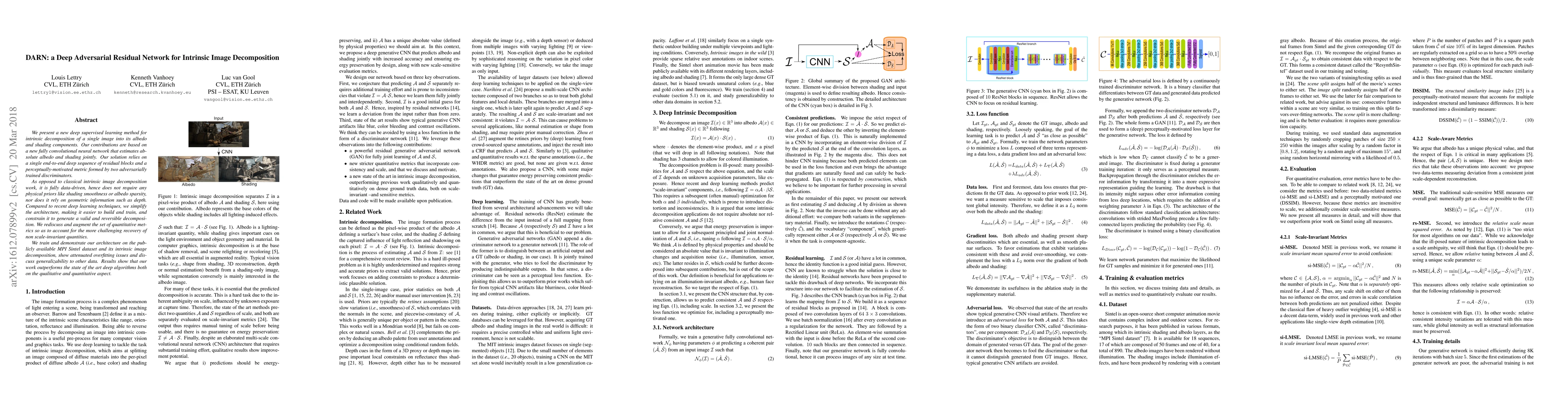 This paper introduces DARN, a Deep Adversarial Residual Network for intrinsic image decomposition into albedo and shading, using a fully convolutional architecture without physical priors. It outperforms existing methods on the MPI Sintel dataset and demonstrates better generalizability.