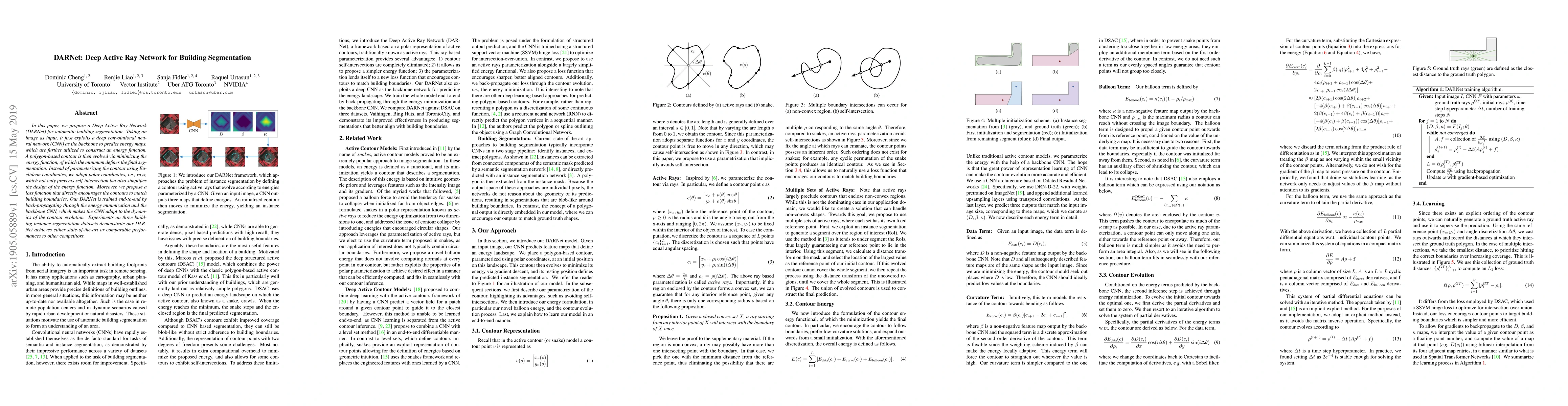 The paper introduces DARNet, a Deep Active Ray Network for building segmentation, which uses a deep CNN to predict energy maps and employs polar coordinates for contour evolution to prevent self-intersection. The network achieves competitive results on building segmentation datasets.