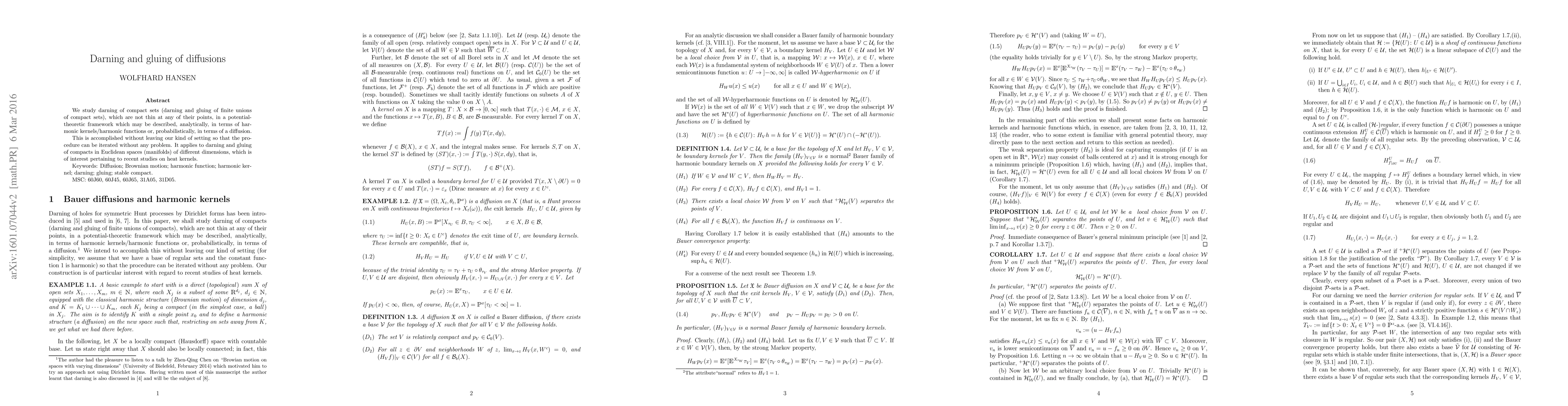 This paper introduces a method for darning and gluing finite unions of compact sets in a potential-theoretic framework, using harmonic kernels or diffusion processes. The approach is applicable to Euclidean spaces and manifolds of different dimensions, relevant to recent studies on heat kernels.