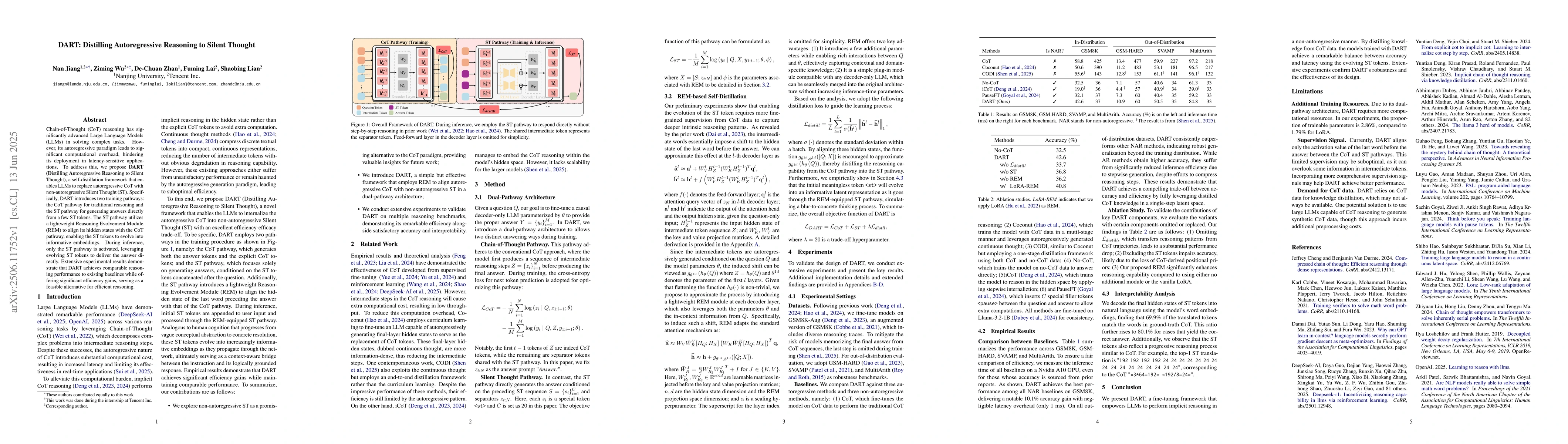 Chain-of-Thought (CoT) reasoning has significantly advanced Large Language Models (LLMs) in solving complex tasks. However, its autoregressive paradigm leads to significant computational overhead, hindering its deployment in latency-sensitive applications. To address this, we propose \textbf{DART} (\textbf{D}istilling \textbf{A}utoregressive \textbf{R}easoning to Silent \textbf{T}hought), a self-distillation framework that enables LLMs to replace autoregressive CoT with non-autoregressive Silent Thought (ST). Specifically, DART introduces two training pathways: the CoT pathway for traditional reasoning and the ST pathway for generating answers directly from a few ST tokens. The ST pathway utilizes a lightweight Reasoning Evolvement Module (REM) to align its hidden states with the CoT pathway, enabling the ST tokens to evolve into informative embeddings. During inference, only the ST pathway is activated, leveraging evolving ST tokens to deliver the answer directly. Extensive experimental results demonstrate that DART achieves comparable reasoning performance to existing baselines while offering significant efficiency gains, serving as a feasible alternative for efficient reasoning.
