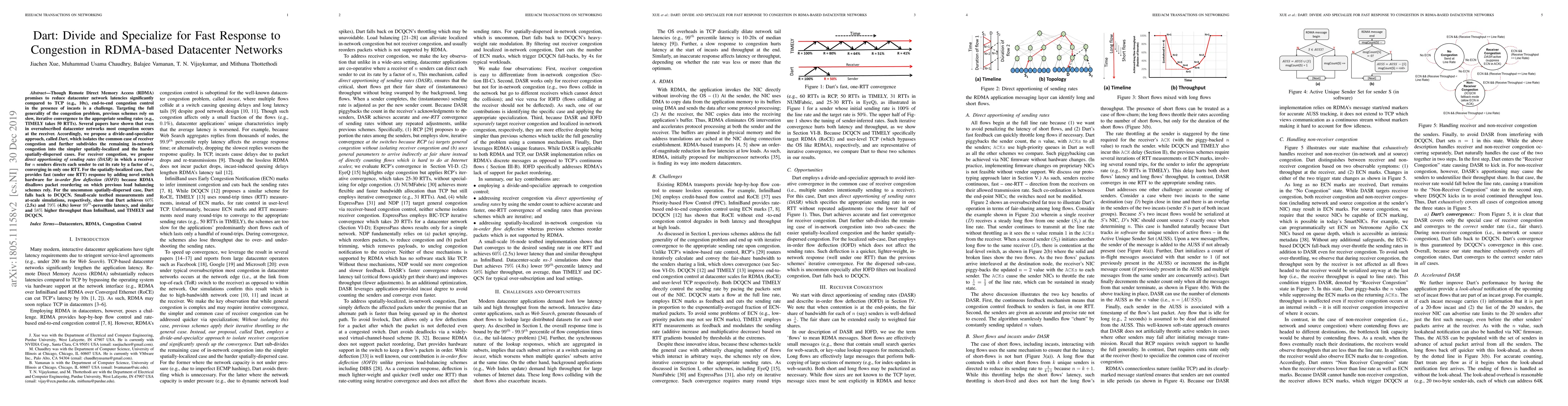 Dart proposes a divide-and-specialize approach to quickly respond to congestion in RDMA-based datacenter networks by isolating receiver congestion and subdividing in-network congestion. It achieves fast convergence for receiver congestion in one RTT and uses novel hardware for localized congestion, significantly reducing latency and improving throughput compared to existing methods.