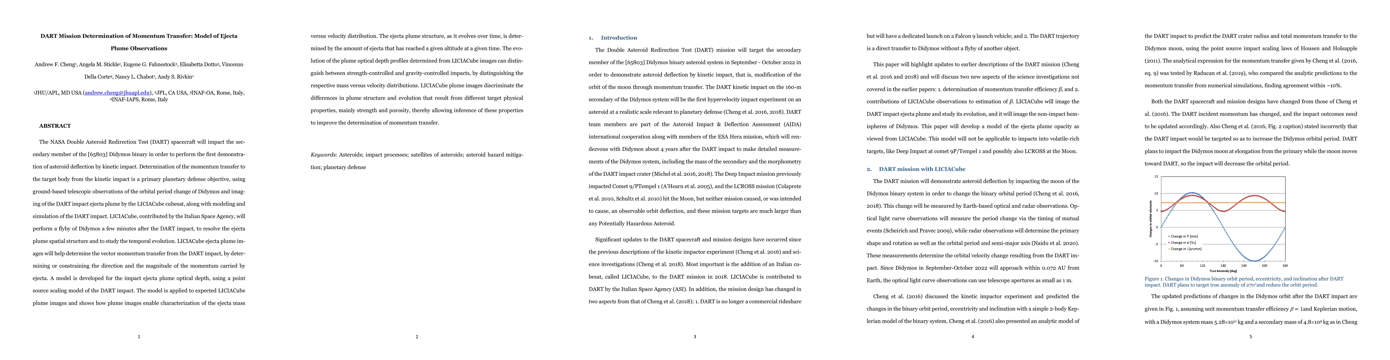 The DART mission aims to demonstrate asteroid deflection via kinetic impact, with LICIACube imaging the ejecta plume to determine momentum transfer. LICIACube's images will characterize ejecta mass versus velocity distribution, aiding in distinguishing between different impact regimes and inferring target properties to refine momentum transfer calculations.