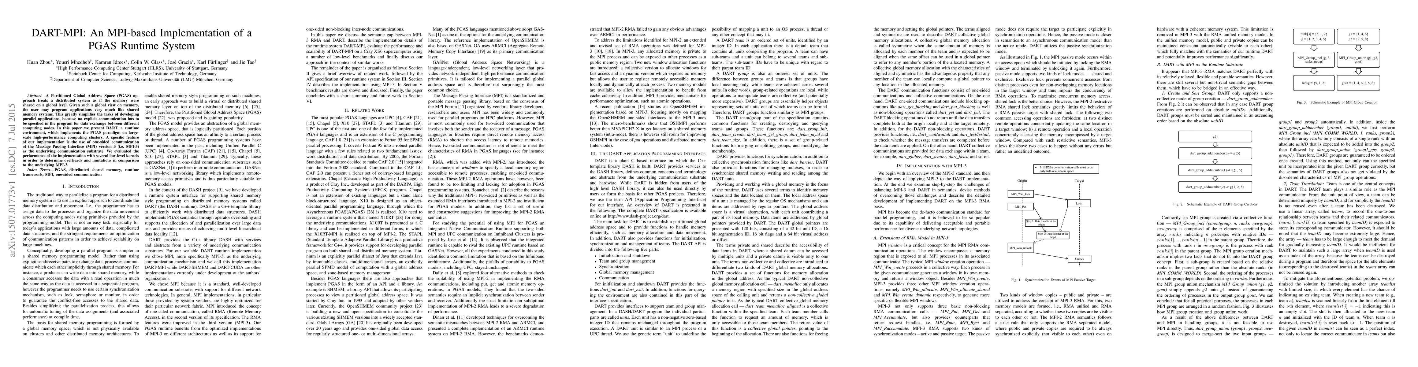 Title: DART-MPI: An MPI-based Implementation of a PGAS Runtime System Summary: This paper introduces DART, a runtime environment implementing the PGAS paradigm on large-scale clusters, utilizing MPI-3 for one-sided communication to simplify parallel application development. Performance evaluations reveal overheads and limitations compared to native MPI-3.