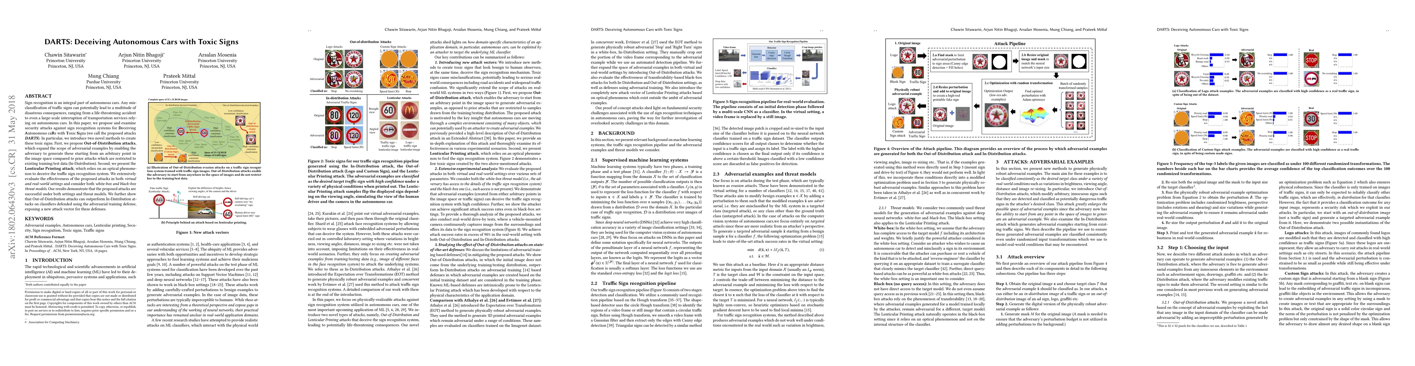 This paper presents DARTS, a method to deceive autonomous car sign recognition systems using two novel attacks: Out-of-Distribution, generating adversarial examples from arbitrary image points, and Lenticular Printing, exploiting an optical phenomenon. Both attacks successfully mislead systems in virtual and real-world settings, under white-box and black-box threat models, with Out-of-Distribution attacks outperforming others against adversarial training defenses.