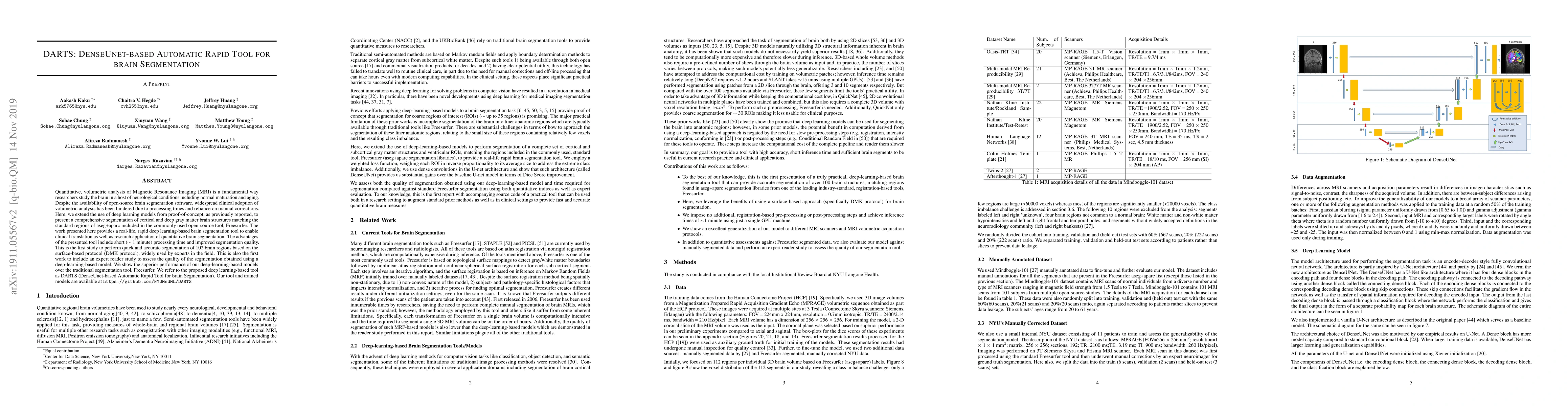 DARTS is a deep learning-based tool for rapid brain segmentation, achieving high-quality segmentation of 102 brain regions in about 1 minute, significantly faster than traditional methods, and demonstrated superior performance compared to Freesurfer. An expert reader study confirmed its accuracy.