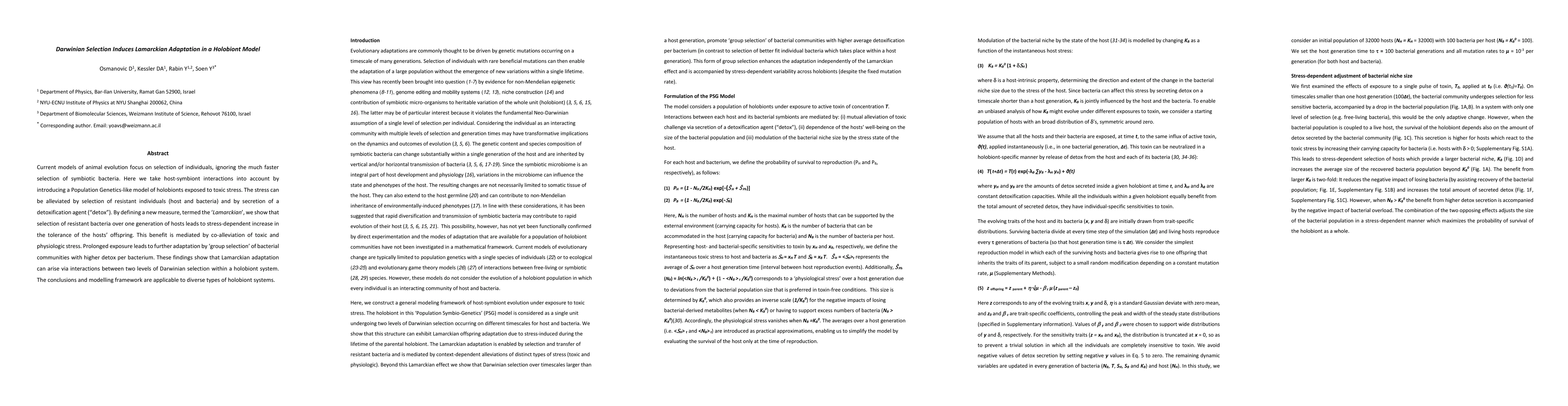 This paper proposes a novel holobiont model demonstrating how Darwinian selection of symbiotic bacteria can induce Lamarckian adaptation in host organisms, showing that bacterial resistance can enhance host offspring's tolerance to toxic stress through detoxification mechanisms. The findings suggest that interactions between host and symbiont selection can lead to adaptive benefits across generations.