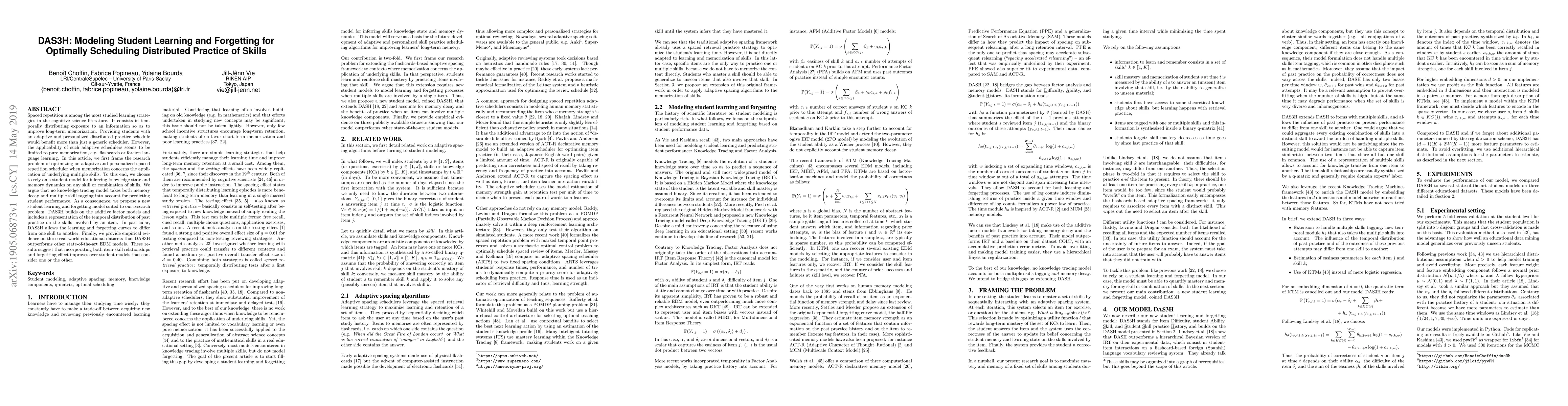 Spaced repetition is among the most studied learning strategies in the cognitive science literature. It consists in temporally distributing exposure to an information so as to improve long-term memorization. Providing students with an adaptive and personalized distributed practice schedule would benefit more than just a generic scheduler. However, the applicability of such adaptive schedulers seems to be limited to pure memorization, e.g. flashcards or foreign language learning. In this article, we first frame the research problem of optimizing an adaptive and personalized spaced repetition scheduler when memorization concerns the application of underlying multiple skills. To this end, we choose to rely on a student model for inferring knowledge state and memory dynamics on any skill or combination of skills. We argue that no knowledge tracing model takes both memory decay and multiple skill tagging into account for predicting student performance. As a consequence, we propose a new student learning and forgetting model suited to our research problem: DAS3H builds on the additive factor models and includes a representation of the temporal distribution of past practice on the skills involved by an item. In particular, DAS3H allows the learning and forgetting curves to differ from one skill to another. Finally, we provide empirical evidence on three real-world educational datasets that DAS3H outperforms other state-of-the-art EDM models. These results suggest that incorporating both item-skill relationships and forgetting effect improves over student models that consider one or the other.