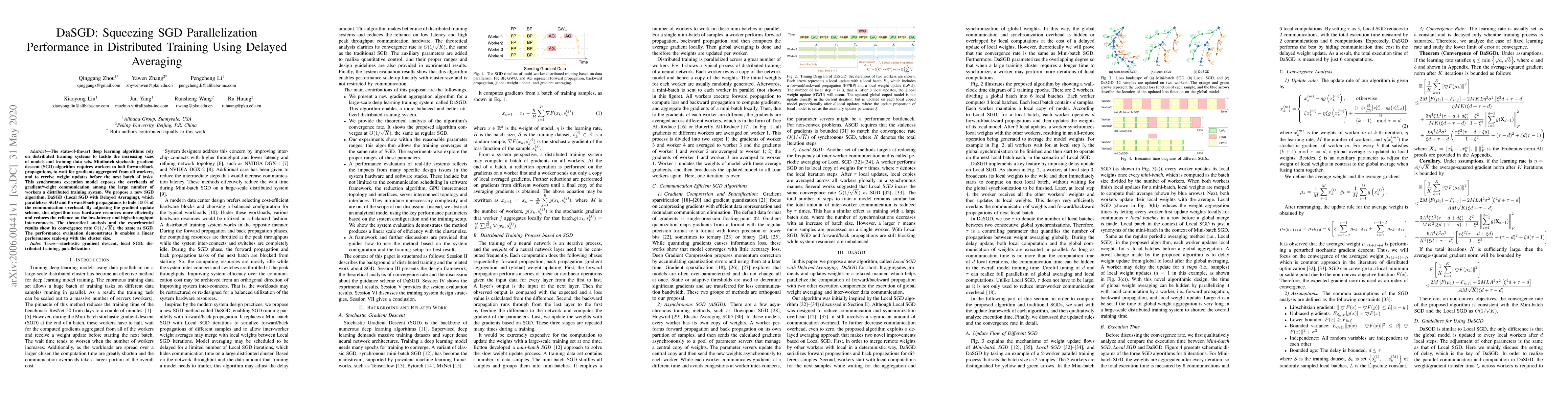 DaSGD introduces a new parallelization method for SGD in distributed training that employs delayed averaging to hide communication overhead, achieving linear performance scale-up with cluster size while maintaining convergence rate comparable to traditional SGD.