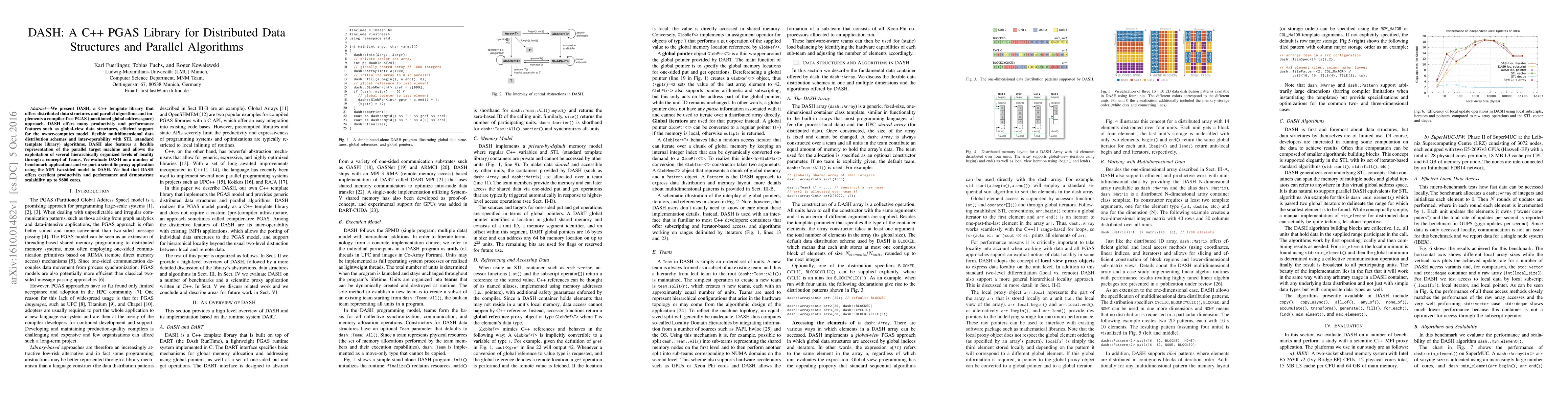 DASH is a C++ PGAS library for distributed data structures and parallel algorithms, offering global-view data and efficient owner-computes model support. It scales effectively to 9800 cores, demonstrating high productivity and performance in benchmark applications.