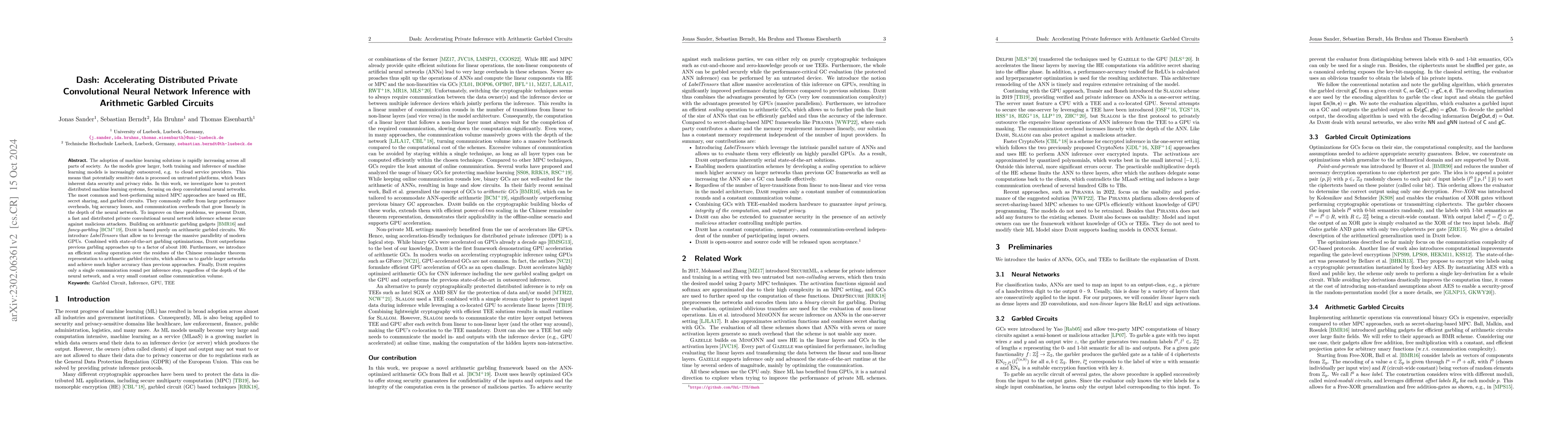 Dash presents a novel distributed private machine learning inference scheme based on arithmetic garbled circuits, significantly reducing communication overhead and scaling better than previous methods. This approach achieves up to 140 times faster performance compared to prior schemes, while maintaining security against malicious attackers.
