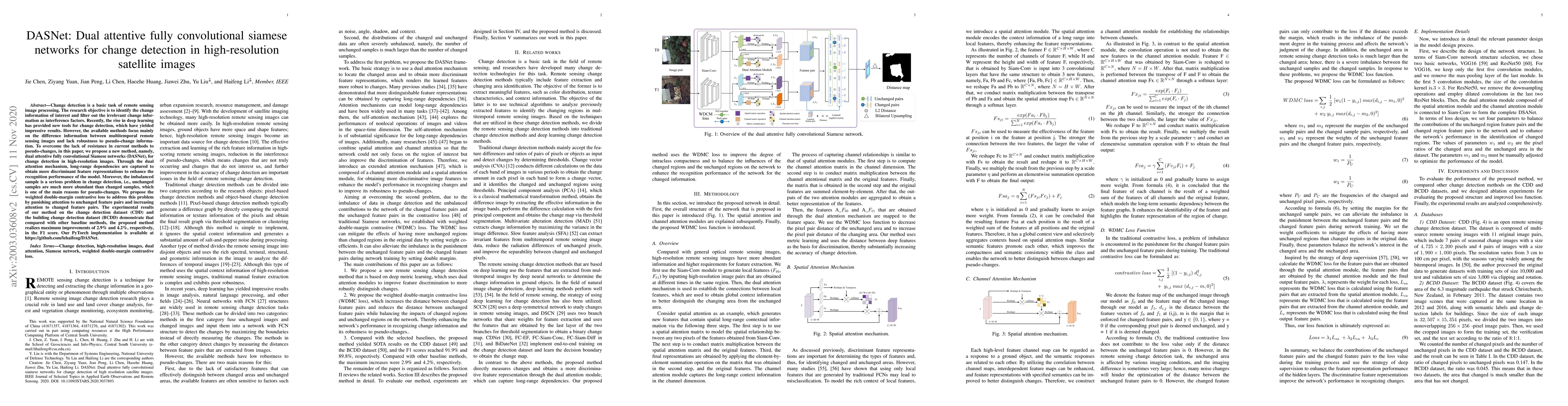 DASNet introduces dual attentive fully convolutional Siamese networks for high-resolution satellite image change detection, leveraging dual-attention to capture long-range dependencies and a weighted double margin contrastive loss to address class imbalance, achieving up to 3.6% improvement in F1 score over baseline methods.