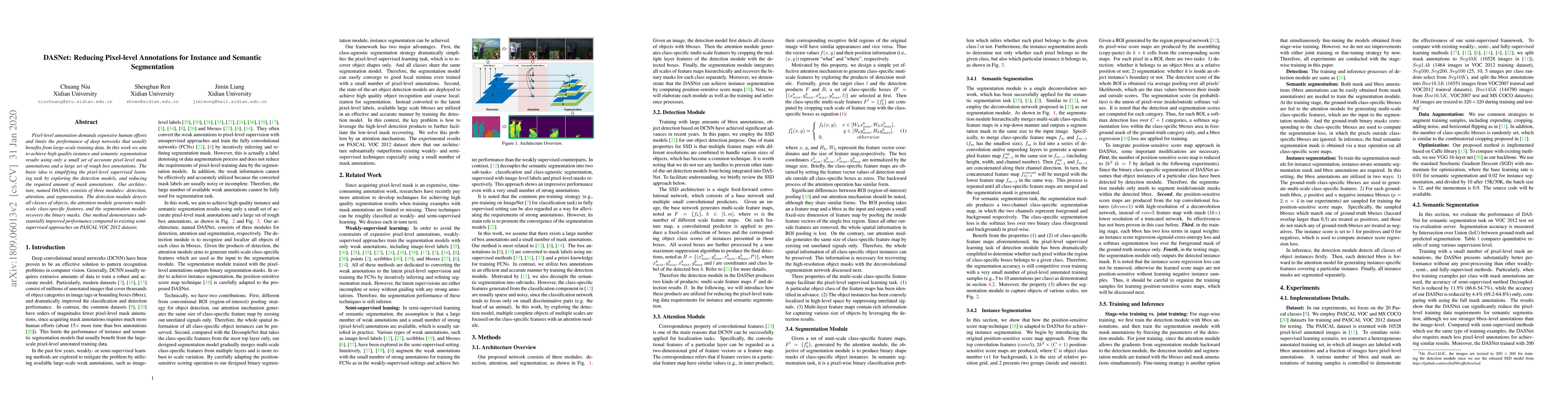 DASNet reduces the need for expensive pixel-level annotations in instance and semantic segmentation by leveraging box annotations and detection models. It consists of detection, attention, and segmentation modules, achieving superior performance compared to semi-supervised methods on the PASCAL VOC 2012 dataset.